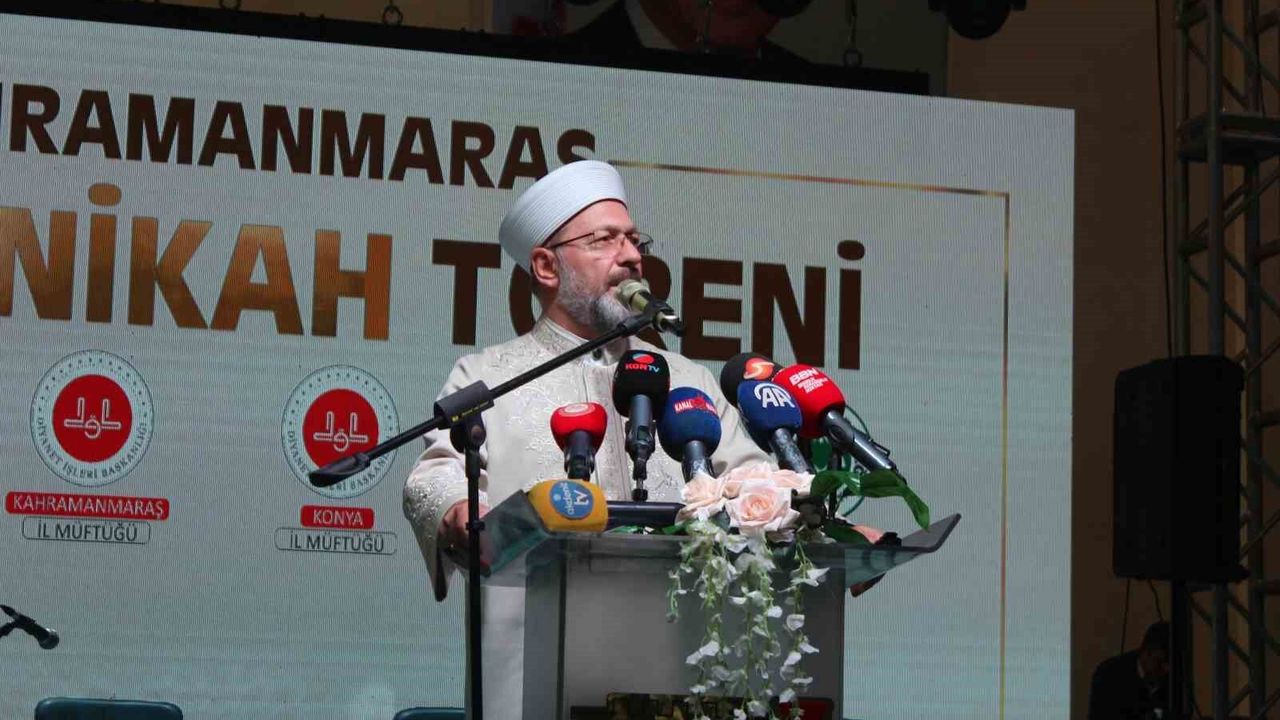 Aile yapısının önemine dikkat çeken Erbaş, “Çok güzel bir merasimdeyiz. Çünkü 100 çiftimiz hayatlarının en önemli dönüm noktaları olan evlilik merasimlerini bu akşam gerçekleştiriyorlar. Evlilik sürecini yaşarken mutlaka anlaşamadığınız noktalar olabilir, zaman zaman tartıştığınız noktalar olabilir. İlacınız sabırdır, ilacımız tahammüldür. Sevgiyi, saygıyı, sadakati sabırla sürdürürseniz selamete ulaşırsınız” ifadelerini kullandı.
