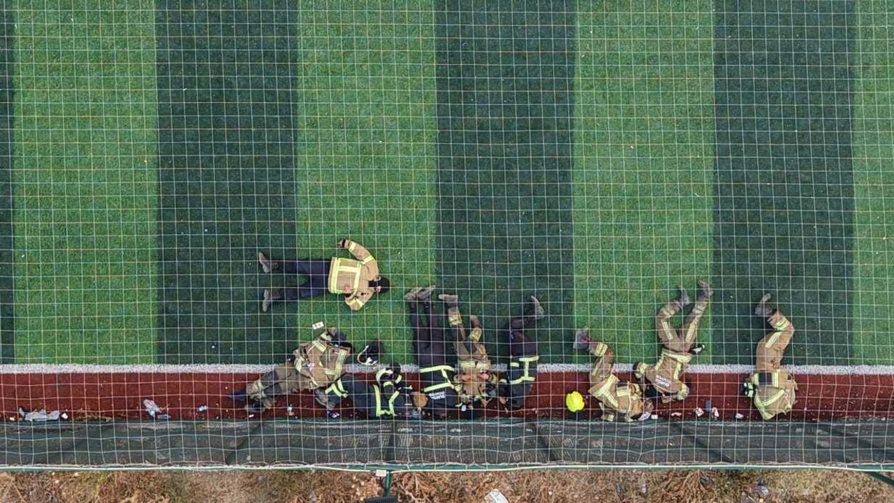 Halı sahada zor şartlarda birkaç saatliğine dinlenip yeniden göreve gitmek için hazırlanan itfaiye erleri dikkat çeken görüntüler oluşturdu.
