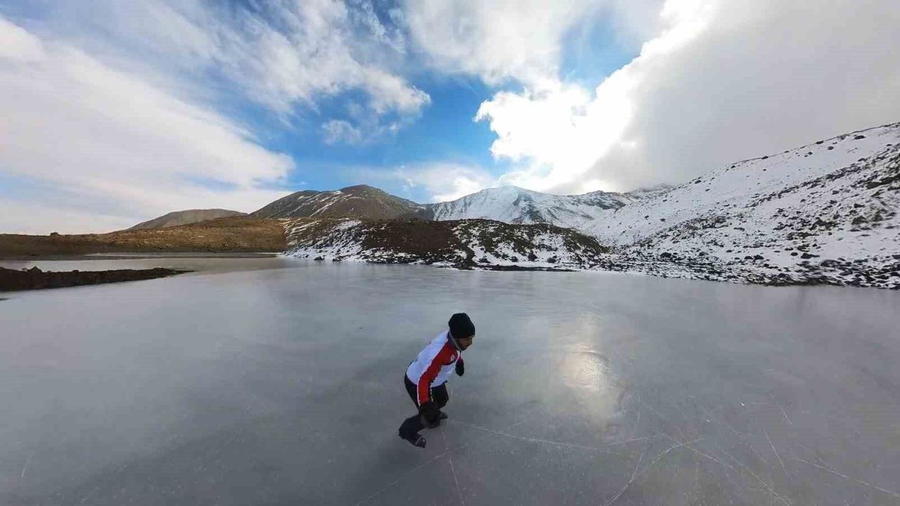 Doğu Anadolu’da son günlerde etkili olan soğuk hava nedeniyle Erzincan’da kentin kuzeyinde bulunan Keşiş Dağlarında, 3 bin 549 metre yükseklikte Yedi Göller mevkiinde bulunan göletlerin yüzeyi buzla kaplandı. Kross motorlarla Keşiş Dağlarında bulunan Yedi Göller mevkiine giden Atila, burada kalınlığı yaklaşık 15-20 santimetreyi bulan buzu üzerinde paten yapmanın keyfini çıkardı. O anları kamerasıyla da anbean kayıt altına alan Atila, donan göl üzerinde yaklaşık 1 saat buz pateni yaptı.