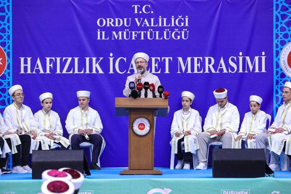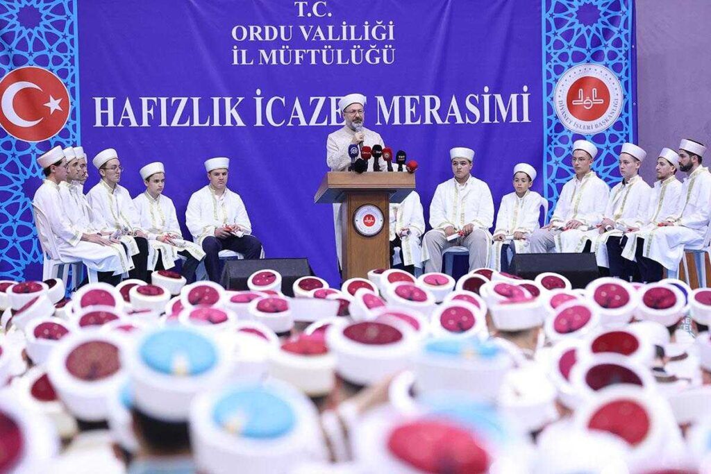 Hafızların hocalarını ve ailelerini de tebrik eden Başkan Erbaş, "Ülkemizde icazet namesini almış, hak etmiş, sizler gibi imtihana girmiş, başarmış 255 bin hafızımız var elhamdülillah. Bir o kadar da icazet namesiz olan hafızımız var. Yarım milyon Kur'an hafızına sahip bir ülkeyiz, çok şükür." ifadesini kullandı.