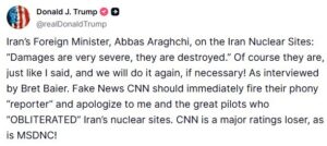 ABD Başkanı Donald Trump’tan, ülkesinin İran’ın nükleer tesislerini hedef alan saldırıları ile ilgili yeni bir açıklama geldi. Kendisine ait Truth sosyal medya platformu üzerinden yaptığı paylaşımda İran Dışişleri Bakanı Abbas Arakçi’nin Tahran’ın nükleer tesisleri ile ilgili "Zarar çok ciddi, yok edildiler" dediğini belirten Trump, "Tabii ki öyle! Tam da dediğim gibi. Ve gerekli olması halinde bunu tekrar yaparız" ifadelerini kullandı. ABD merkezli haber kanalı CNN’in ABD'nin İran'ın nükleer tesislerine yönelik saldırılarının Tahran'ın nükleer silah üretme kapasitesini tam olarak engellemediği yönünde haberler yaptığını hatırlatan Trump, "Yalan haber yapan CNN yalancı ‘muhabirini’ derhal kovmalı, benden ve İran’ın nükleer tesislerini ‘yok eden’ harika pilotlardan özür dilemelidir" dedi. Trump, taraflı olmakla eleştirdiği CNN’in, aynı MSNBC kanalı gibi izlenme oranlarında düşüş yaşadığını iddia etti.