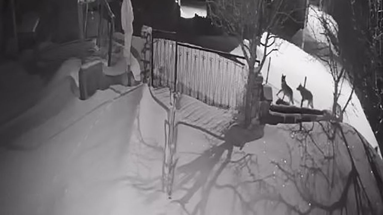 Bir evin güvenlik kamerasına yansıyan görüntülerde yaklaşık 9 yetişkin kurdun yerleşim alanı içerisinde dolaşarak yiyecek aradığı görüldü. Kurtların evlerin etrafında uzun süre gezdiği anlar kameralara saniye saniye yansıdı.