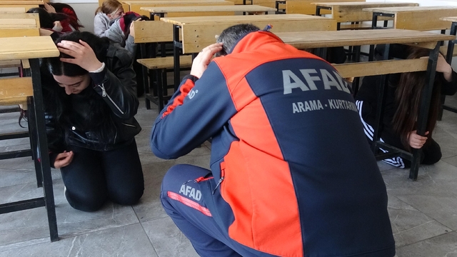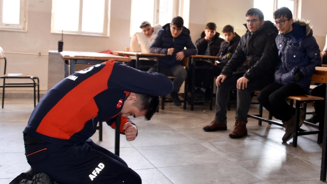 Erzurum İl Afet ve Acil Durum (AFAD) Müdürlüğü eğitmenleri, Kazım Karabekir Mesleki ve Teknik Anadolu Lisesi'nde öğrencilere deprem, öğretmenlere de yangın anında yapılması gerekenleri anlattı. Sınıf ve salonlarda yapılan bilgilendirme sonunda öğrenciler, senaryoya göre meydana gelen deprem sonrası çök-kapan-tutun uygulamasının ardından okulu boşaltırken, öğretmenler de aldıkları bilgilerle yangına müdahale etti.