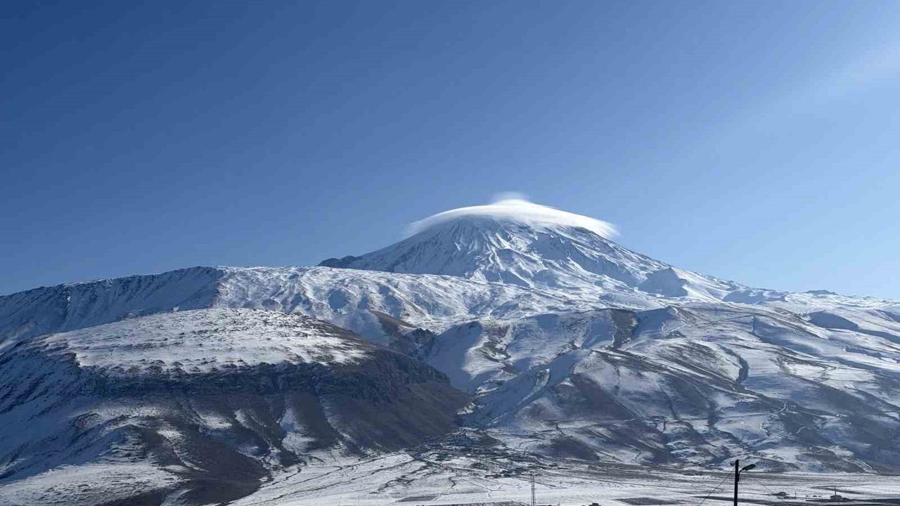 Ağrı Dağı, bu kez görsel bir doğa harikasıyla gündemde. Dağın üst kısımlarını ve zirvesini saran, halk arasında "şapka" olarak bilinen mercek bulutu, bölgeyi etkisi altına aldı. Geniş bir alana yayılan bu büyük bulut, dağın karlı manzarasıyla muazzam bir uyum içinde birleşerek büyüleyici bir görüntü oluşturdu. Mercek bulutları, dağın yüksek rakımlarındaki hava şartlarının etkisiyle oluşan özel bir atmosfer olayıdır. Bu bulutlar, dağın zirvesinin etrafında adeta bir "şapka" gibi durur ve dağın etrafındaki hava akımlarının, bulutları yoğunlaştırarak şekil almasına neden oluyor.