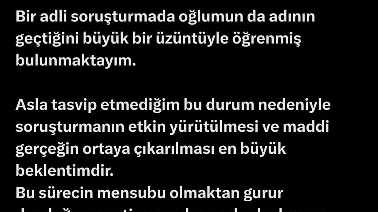 Bir adli soruşturmada oğlumun da adının geçtiğini büyük bir üzüntüyle öğrenmiş bulunmaktayım. Asla tasvip etmediğim bu durum nedeniyle soruşturmanın etkin yürütülmesi ve maddi gerçeğin ortaya çıkarılması en büyük beklentimdir. Bu sürecin, mensubu olmaktan gurur duyduğum partime ve dava arkadaşlarıma zarar vermemesi için partimden istifa ediyorum."