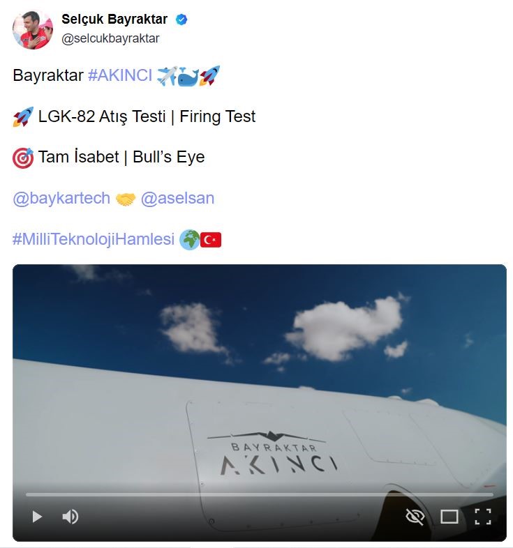 Sosyal medya hesabından test görüntüsünü paylaşan Baykar Yönetim Kurulu Başkanı Selçuk Bayraktar," LGK-82 Atış Testi Tam İsabet" dedi.