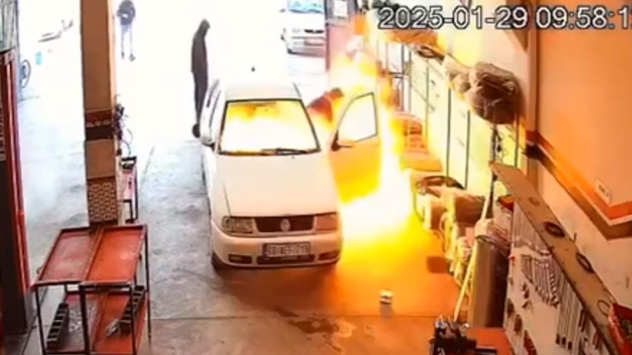 Güvenlik kamerası görüntülerinde aracın dükkan içine alınışı, araç sürücüsünün tam araçtan inerken aracın alevlerle parlaması ve sürücünün son anda kurtulması görülüyor. Aracın patlama sesiyle parlaması herkeste şok etkisi oluştururken, bir süre ne olduğunu anlayamayan vatandaşlar tekrar bir patlama riskine karşı kaçıştı.