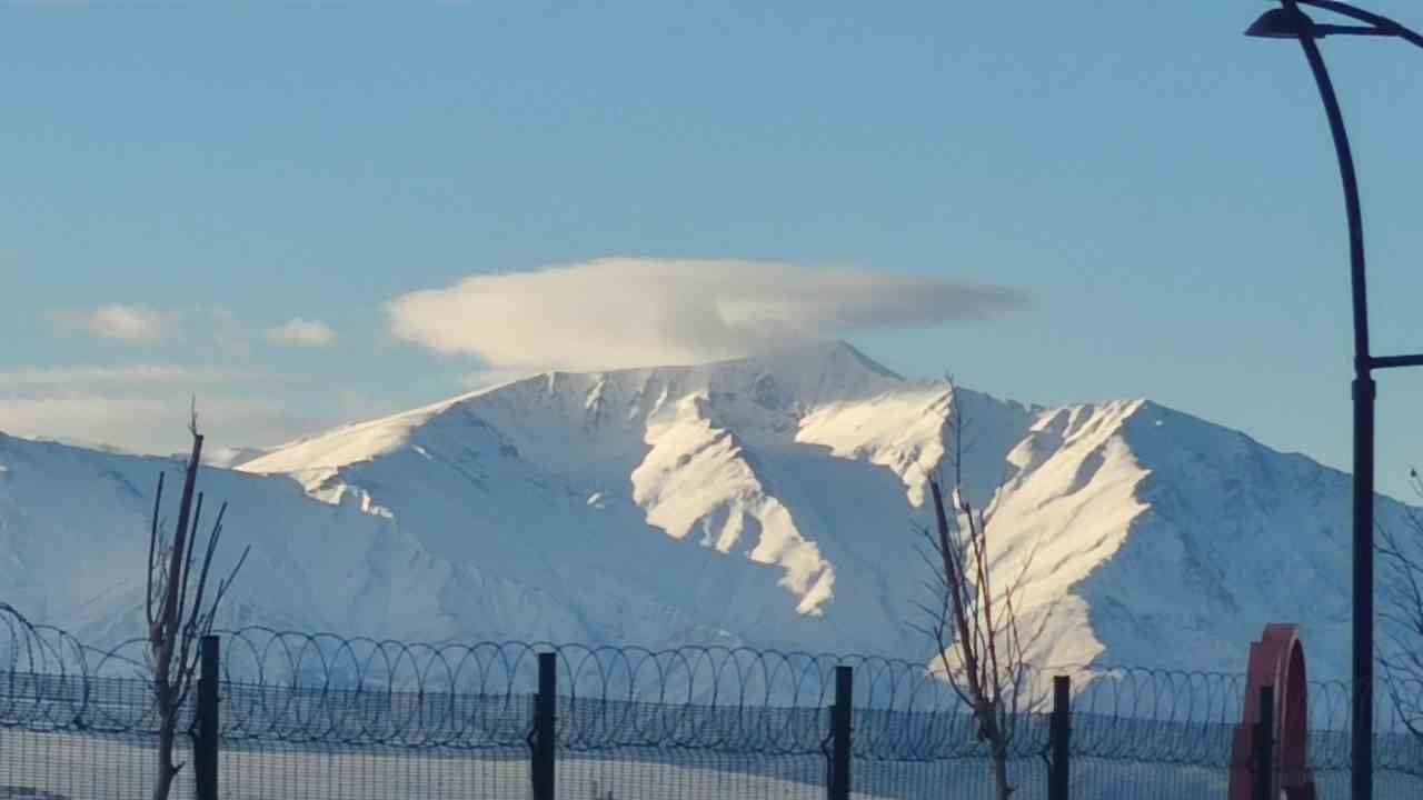 Van’ın Gevaş ilçesinde 3550 rakımlı Artos Dağı’nın karlı zirvesinde şapka şeklinde mercek bulutu oluştu.
