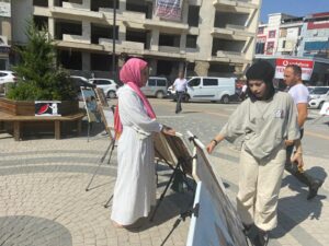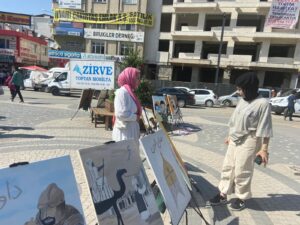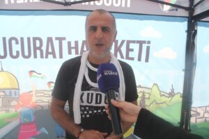 Hucurat Hareketi Derneği Başkanı Eyüp Güzel, “Biz kızım Şüheda ile birlikte 13 Temmuz’da İstanbuldan yola çıktık “Kudüs Seferberliği isimli projemiz kapsamında Türkiye turu yapıyoruz. Yaklaşık olarak 25 ya da 30 civarında şehri dolaşacağız. Karadeniz turunu bitirdik. Trabzondan sonra Erzuruma geçerek Doğu Anadolu turuna başladık. Şuan Van’dayız. Buradan sonra Tatvan, Siirt, Diyarbakır, Batman şeklinde devam edecek. İnşallah turumuz bittikten sonra İstanbul’a başladığımız yere geri döneceğiz. 1 günlük sergi açıyoruz. Aynı zamanda çadırımız içerisine masa kuruyoruz. Burada boyama sayfaları üzerinde çocuklar buraya gelip boyama yapıyorlar. Aynı zamanda çocuklara birer tanede Filistin, Kudüs ve Mescidi Aksayla alakalı hikaye kitabı ve masal kitabı hediye ediyoruz. Bu şekilde bir farkındalık oluşturmaya çalışıyoruz. Yaşanan bir soykırım süreci var. Bu soykırım süreci televizyon ve internet ortamında bol bol paylaşılıyor. Fakat insanlar kendi şehrinde konuyla alakalı resim sergisi açtığımız zaman biraz daha farklı bir bilinç altına girip, konuyu biraz daha sahipleniyorlar. Olumlu tepkiler alıyoruz. Kimileri çok teşekkür ediyor buraya geldik diye. Kimisi dua ediyor. Bu şekilde günü birlik olarak, Her şehirde sergimizi açıp, yola devam ediyoruz. Sergide toplam 35 eserimiz var. Bunların bir çoğunu ben çizdim. Diğer kısmını da Türkiye’nin muteber şehirlerinden hanımlar çizdiler. Kolektif bir çalışma. Civar çok kalabalık. Fakat güneş olduğu için çok sıcak. İnsanlar çok fazla durup bekleyemiyorlar maalesef. Ama hava kırıldığı zaman daha yoğun bir ilgi olacağını düşünüyorum” dedi.
