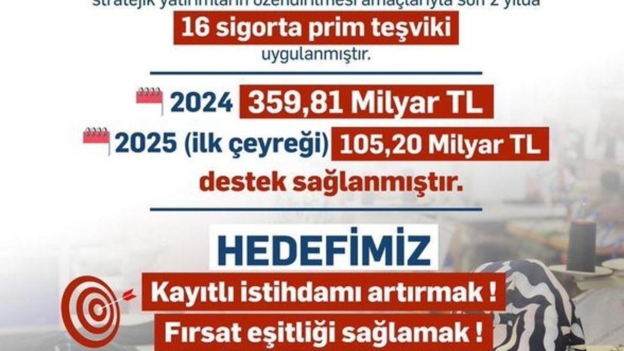 "Kadınlar, gençler ve engelli vatandaşlarımız başta olmak üzere dezavantajlı grupların işgücüne katılımlarını destekliyoruz. Son 2 yılda 16 sigorta prim teşviki uyguladık. 2024 yılında 359.8 milyar lira, 2025 yılının ilk çeyreğinde 105,2 milyar lira destek sağladık."