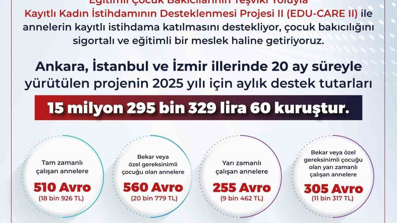 Çalışma ve Sosyal Güvenlik Bakanı Vedat Işıkhan, sosyal medya hesabından yaptığı paylaşımda, “Çalışan annelerin her zaman yanındayız” dedi. Bakan Işıkhan, paylaşımında EDU-CARE II sayesinde annelerin kayıtlı istihdama katılmasını desteklediklerini belirterek, “Sigortalı ve eğitimli çocuk bakıcılığını teşvik ediyoruz. Ankara, İstanbul, İzmir illerinde yürütülen projeye 2025 yılında toplam 15 milyon liradan fazla destek tutarı sağlanacak” ifadelerine yer verdi.