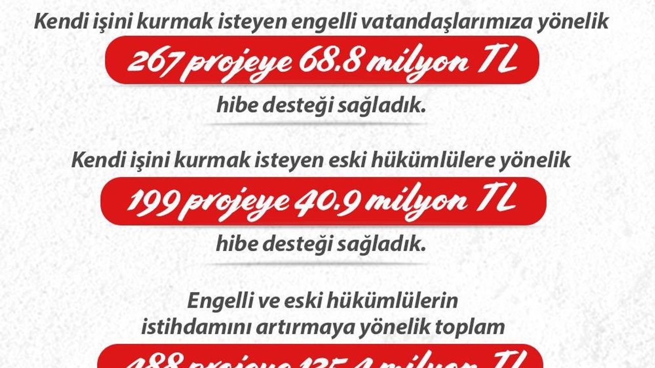 “Engelli ve eski hükümlü vatandaşların istihdamını artırmak için 488 projeye 125,4 milyon lira kaynak sağladık”