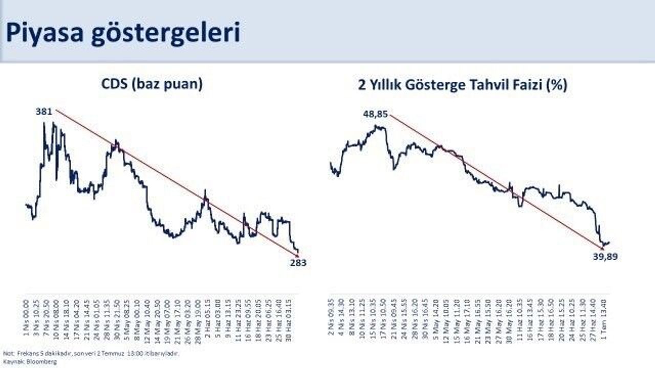 "Küresel koşulların zorluklarına rağmen ihracat, dirençli yapısını koruyor. Cari açık, öngörülerimiz doğrultusunda gerçekleşirken sürdürülebilir seviyelerde kalmaya devam ediyor. Nisan ayında 381 baz puana kadar yükselen risk primi (CDS), 283 baz puana geriledi. İki yıllık gösterge tahvil faizi ise yüzde 49’dan yüzde 40’ın altına indi. CDS ve borçlanma maliyetlerindeki düşüş, kararlı ve sabırlı duruşumuzun olumlu sonuçlarını net bir şekilde ortaya koyuyor. Dezenflasyon süreciyle birlikte yurtiçi finansal koşulların önümüzdeki dönemde daha da iyileşmesini bekliyoruz."