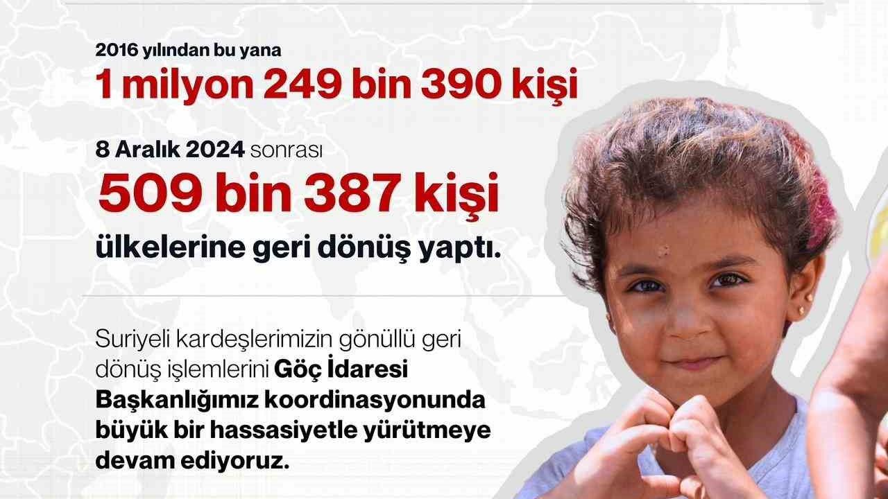 İçişleri Bakanı Ali Yerlikaya, "8 Aralık 2024 tarihi sonrasında toplam 509 bin 387 Suriyeli kardeşimiz ülkelerine geri dönüş yaptı. 2016 yılından bu yana gönüllü geri dönüş yapan Suriyelilerin sayısı 1 milyon 249 bin 390 kişiye ulaştı" dedi.