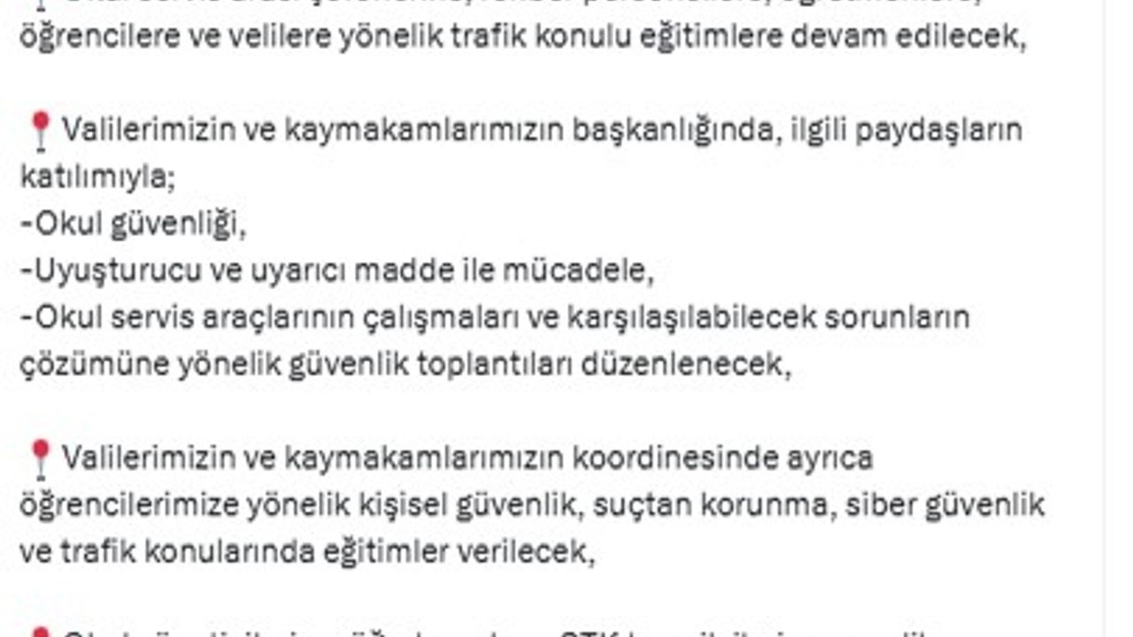 Bakan Yerlikaya, sosyal medya hesabından yaptığı paylaşımda, "2025-2026 eğitim-öğretim yılında öğrencilerimizin eğitimlerini huzur ve güven ortamı içinde sürdürebilmeleri için asayiş ve trafik tedbirlerine ilişkin yayımladığımız genelge ile; okul servis araçları, şoförler ve rehber personellerine yönelik denetim faaliyetleri artırılacak. Okul giriş-çıkış saatlerinde okul önlerinde trafik ekiplerimiz, yaya geçitleri ve hız kurallarına yönelik denetimlerini sıklaştıracak, Okul servis aracı şoförlerine, rehber personellere, öğretmenlere, öğrencilere ve velilere yönelik trafik konulu eğitimlere devam edilecek. Valilerimizin ve kaymakamlarımızın başkanlığında, ilgili paydaşların katılımıyla; okul güvenliği, uyuşturucu ve uyarıcı madde ile mücadele, okul servis araçlarının çalışmaları ve karşılaşılabilecek sorunların çözümüne yönelik güvenlik toplantıları düzenlenecek. Valilerimizin ve kaymakamlarımızın koordinesinde ayrıca öğrencilerimize yönelik kişisel güvenlik, suçtan korunma, siber güvenlik ve trafik konularında eğitimler verilecek. Okul yöneticilerine, öğretmenlere, STK temsilcilerine ve velilere özellikle uyuşturucuyla mücadele konularında bilgilendirmeler yapılacak. Okul çevrelerinde güvenlik kameralarının kurulmasına devam edilecek ve İnternet kafe, oyun salonu ve benzeri iş yerlerine yönelik denetimler artırılacaktır. Yeni eğitim öğretim yılının aydınlık geleceğimiz olan çocuklarımıza ve gençlerimize, öğretmenlerimize, velilerimize ve okul yöneticilerimize hayırlı olmasını diliyorum" ifadelerini kullandı.