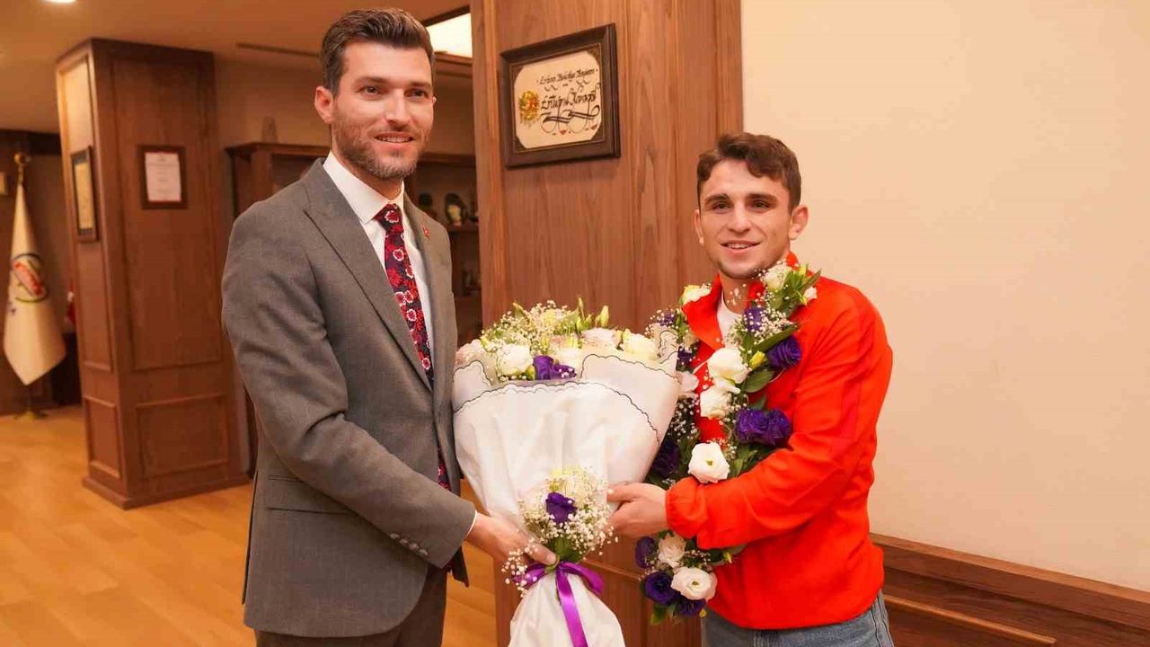 Erbaa Belediye Başkanı Ertuğrul Karagöl Azerbaycan’da düzenlenen Ordulararası Serbest Güreş Şampiyonası’nda Dünya Şampiyonu olan Ahmet Duman’ı tebrik ederek hediye takdim etti.