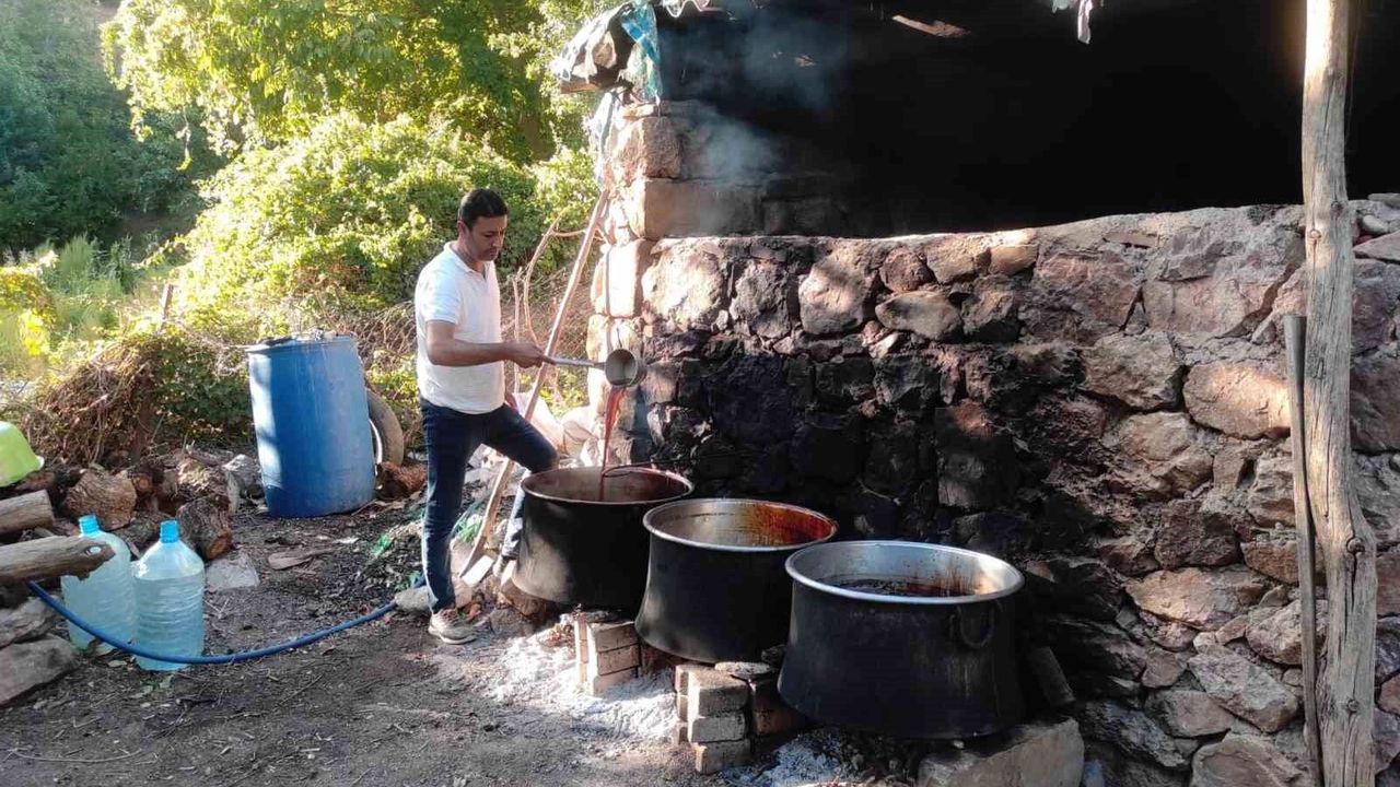 Üzümleri hasat eden vatandaşlar çuvallarda geleneksel yöntemlerle üzüm suyunu çıkararak kazanlarda kaynattı. Pekmez için hazır edilen külle birlikte kazanları saatlerce kaynatarak pekmezlerini hazırlayan köy sakini Mahmut Çelik, bahçelerinde binbir emekle yetiştirdikleri kara üzümü hasat ettiklerini söyledi. Çelik, “Bahçemizde binbir emekle yetiştirdiğimiz kara üzümlerin hasadına başladık. Topladığımız üzümleri eve getirerek bir gün dinlendirdikten sonra dedelerimizin yaptığı gibi, ilkel yöntemlerle ayakla sıkarak şırasını çıkartıp yan yana dizdiğimiz büyük kazanlarda üç gün boyunca altına meşe odunu yakarak kaynatarak organik pekmez elde ediyoruz. Pekmezleri satarak da geçimimizi sağlıyoruz” dedi.