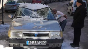 Olay, Velişaban Mahallesi, Yavuz Selim Caddesi’nde yaşandı. Yunus Temur adına kayıtlı 69 AAF 293 plakalı aracın üzerine gece saatlerinde çatıdan kar ve buz kütlesi düştü. Aracın tavanı, kapıları, ön ve arka camları kullanılamaz hale gelirken, devasa kar kütlesi aracı pert etti.