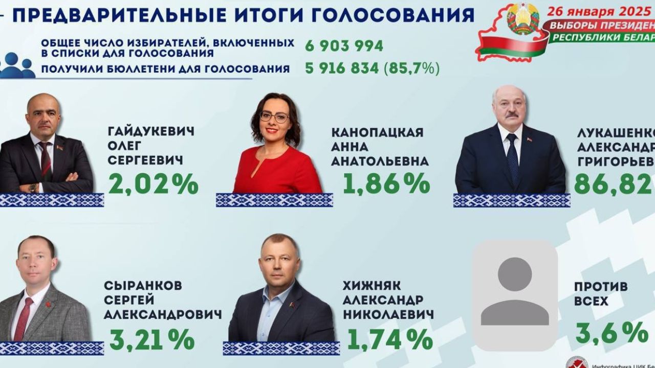 Merkezi Seçim Komisyonu verilerine göre seçimde Belarus Liberal Demokratik Partisi lideri Oleg Gaydukeviç yüzde 2,02, Komünist Partisi Merkez Komistesi Birinci Sekreteri Sergey Sirankov yüzde 3,21, 2020 Devlet Başkanlığı Seçiminde de yarışan eski milletvekili Anna Kanapatskaya yüzde 1,86 ve Cumhuriyetçi Adalet ve Emek Partisi lideri Aleksandr Hijnyak yüzde 1,74 oranında oy aldı. Seçmenlerin yüzde 3,6’sı ise hiçbir adayı tercih etmedi.
