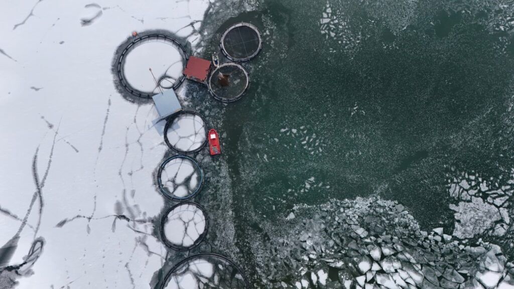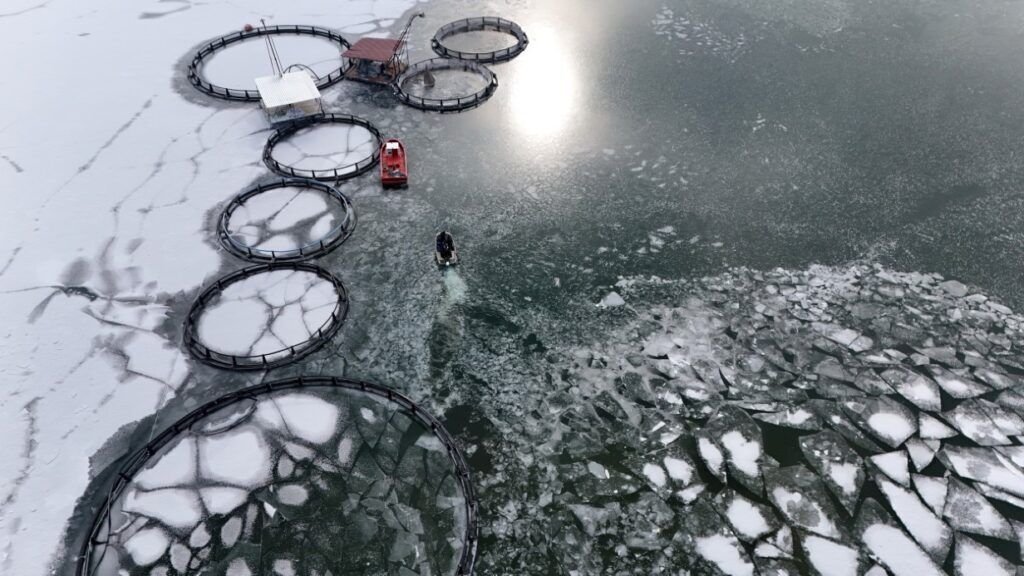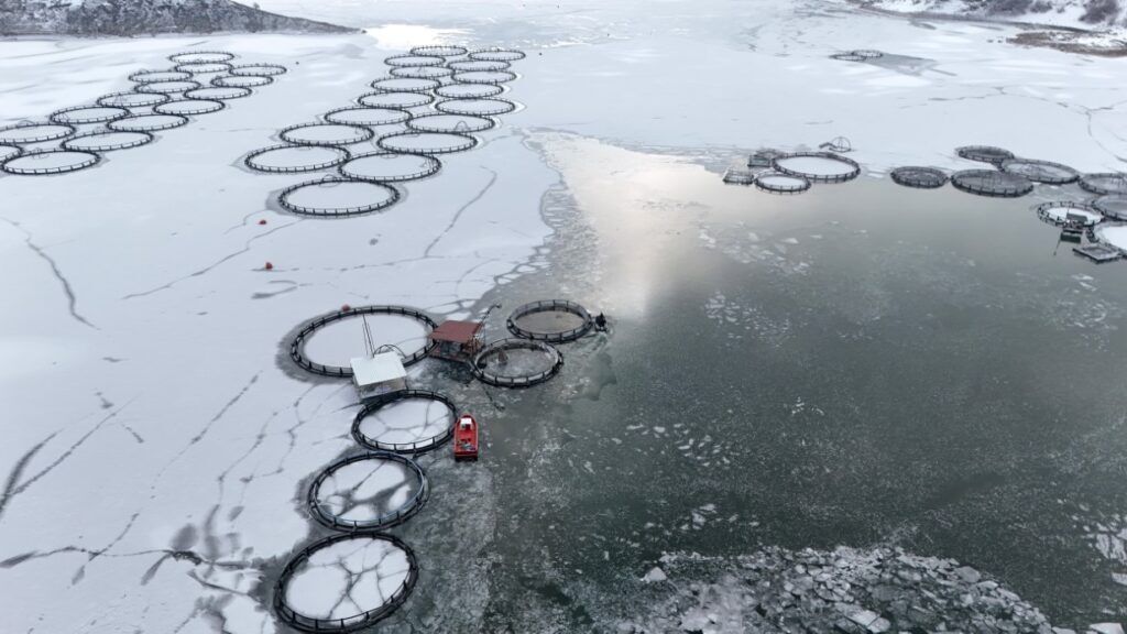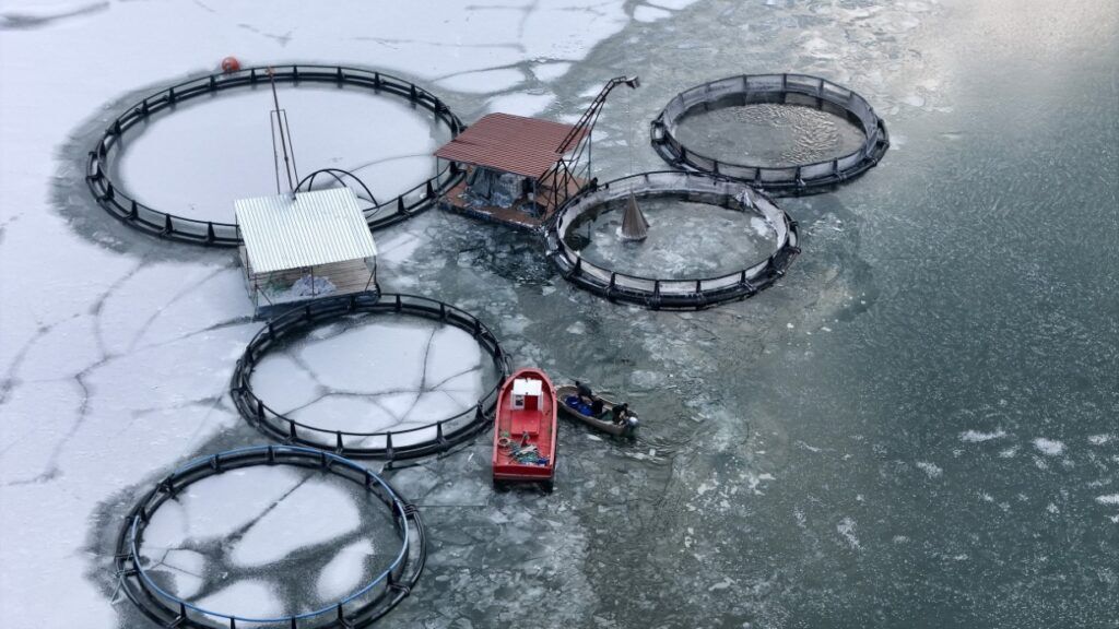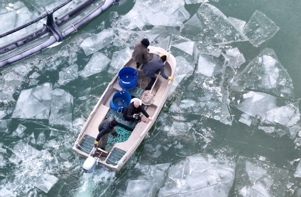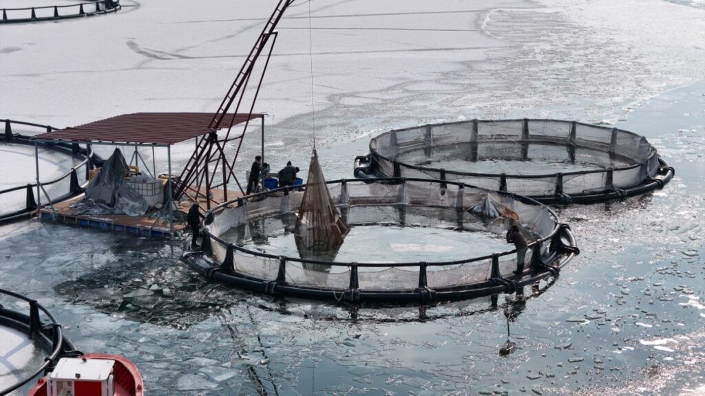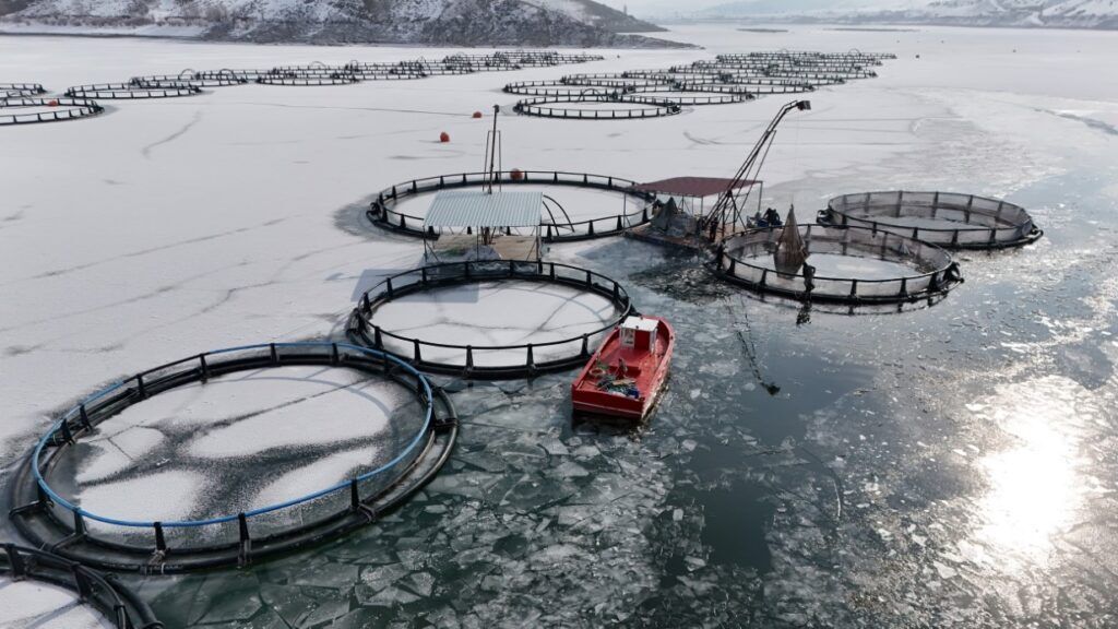 Buzla kaplı gölde buzları kırıp, tehlikeye adeta meydana okuyarak balıkçı tekneleriyle kafeslere ulaşabilen balıkçılar bin bir güçlükle ağları kafeslere indirip balık hasadını yaptılar.