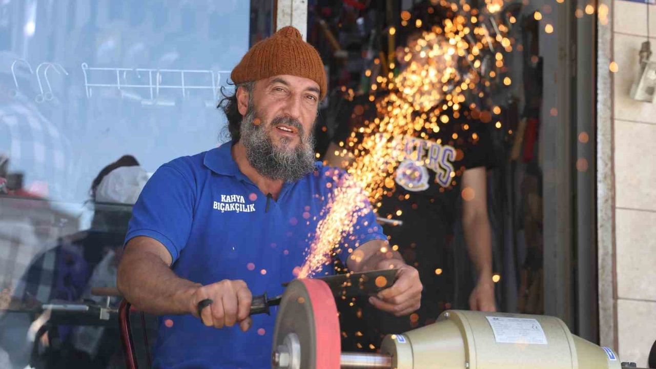 20 yıldır bıçak bileme işi ile uğraştıklarını belirten bileme ustası Turan Kehya, ’’Milletimize bıçakları erken getirmelerini söylüyoruz fakat yine de son 2 güne bıraktılar. Çok yoğunluk yaşanıyor. Erken getirilse bıçaklar daha temiz bir şekilde çıkar. Elimizden geldiği kadarıyla bıçaklarını getiren vatandaşlarımızın bıçaklarını yetiştirmeye çalışıyoruz. Yoğunluktan dolayı arkadaşlarımızı da yardım için yanımıza çağırıyoruz. İş yerimizi sabah saat 07.00 gibi açıyoruz gece 03.00’a kadar bıçak bilemeye devam ediyoruz. Kurban bayramından dolayı bu saatlere kadar çalışıyoruz. Normal günlerde de iş yerimizi aynı saatte açıyoruz ama akşam ezanında kapatıyorduk. Kurban Bayramından dolayı mesai yapıyoruz ve yardımcı olmaları için arkadaşlarımızı çağırıyoruz. Son 3 gün içerisinde günlük olarak bine yakın bıçak biledik” dedi.