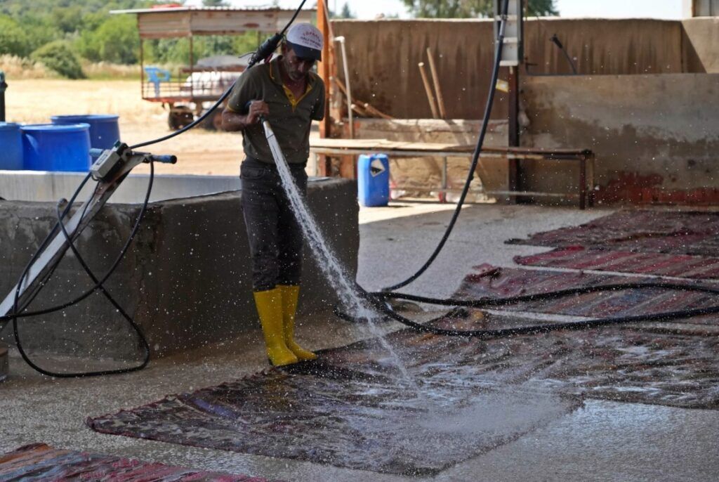Döşemealtı ilçesinde kışın buğday ekilen tarlalar, yaz aylarında hasadın yapılmasıyla halı işletmelerine açılıyor. Arazi sahipleri ya da işletmeler, aralarında yüz yıllık tarihi olanların da bulunduğu halı ve kilimleri önce tamir ediyor, ardından mikroplardan arındırmak için steril havuzlara sokuyor.