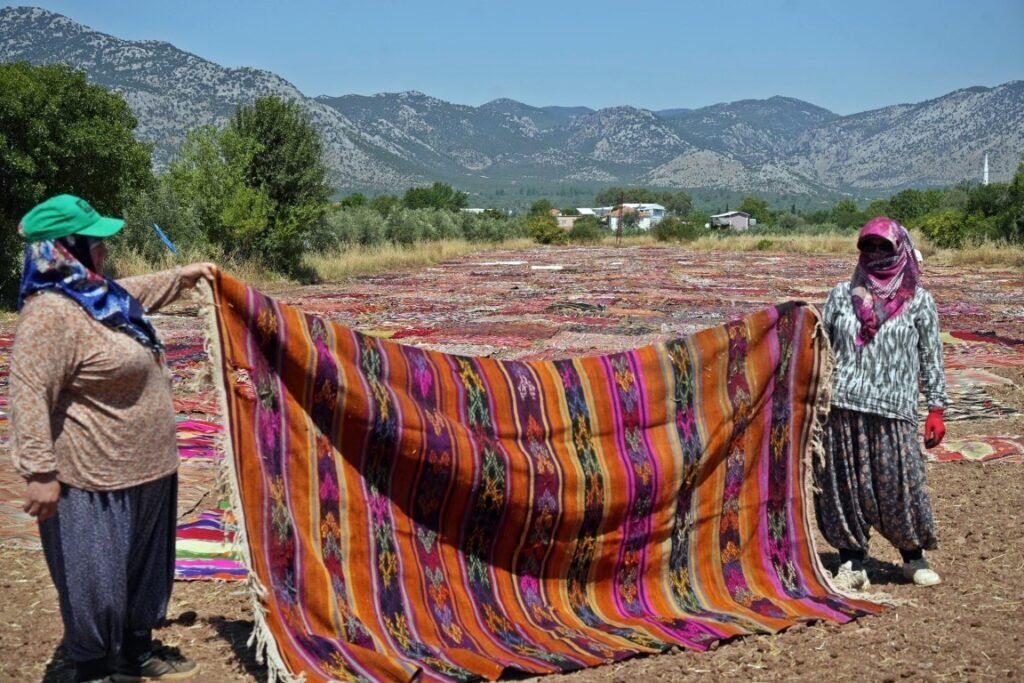 Daha sonra güneşe serilen halı ve kilimlerin renkleri soldurulup pastele dönüşmesi sağlanıyor. Tarlada görsel şölen oluşturan 20 bini aşkın halı ve kilim, güneşin altında belirli aralıklarla çevrilerek nemi ve sıcağı iyi şekilde alması, renklerin tonlamasının sağlamlaşması sağlanıyor.