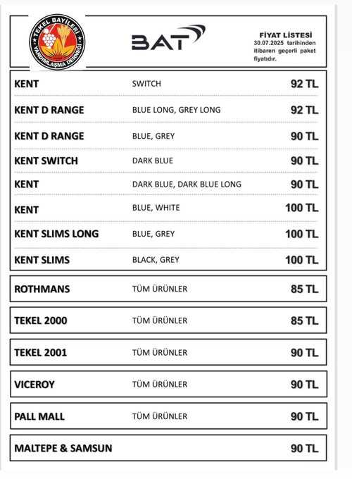 Bu son zamla birlikte, BAT grubundaki en ucuz sigaranın fiyatı 85 liraya yükselirken, en pahalı paket ise 100 liradan satılmaya başlandı.