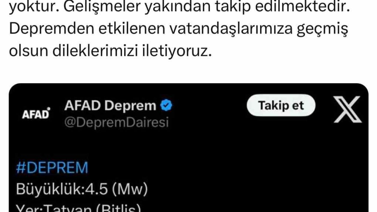 Bitlis Valiliğinin sosyal medya hesabından yapılan yazılı açıklamada, “İlimiz Tatvan ilçesinde saat 14.50’de 4,5 büyüklüğünde bir deprem meydana gelmiştir. AFAD ve ilgili kuruluşlarımızın ekipleri, saha taramalarına vakit kaybetmeden başlamıştır. Şu ana kadar bize ulaşan olumsuz bir durum bulunmamaktadır. Gelişmeler yakından takip edilmektedir. Depremden etkilenen vatandaşlarımıza geçmiş olsun dileklerimizi iletiyoruz” denildi.