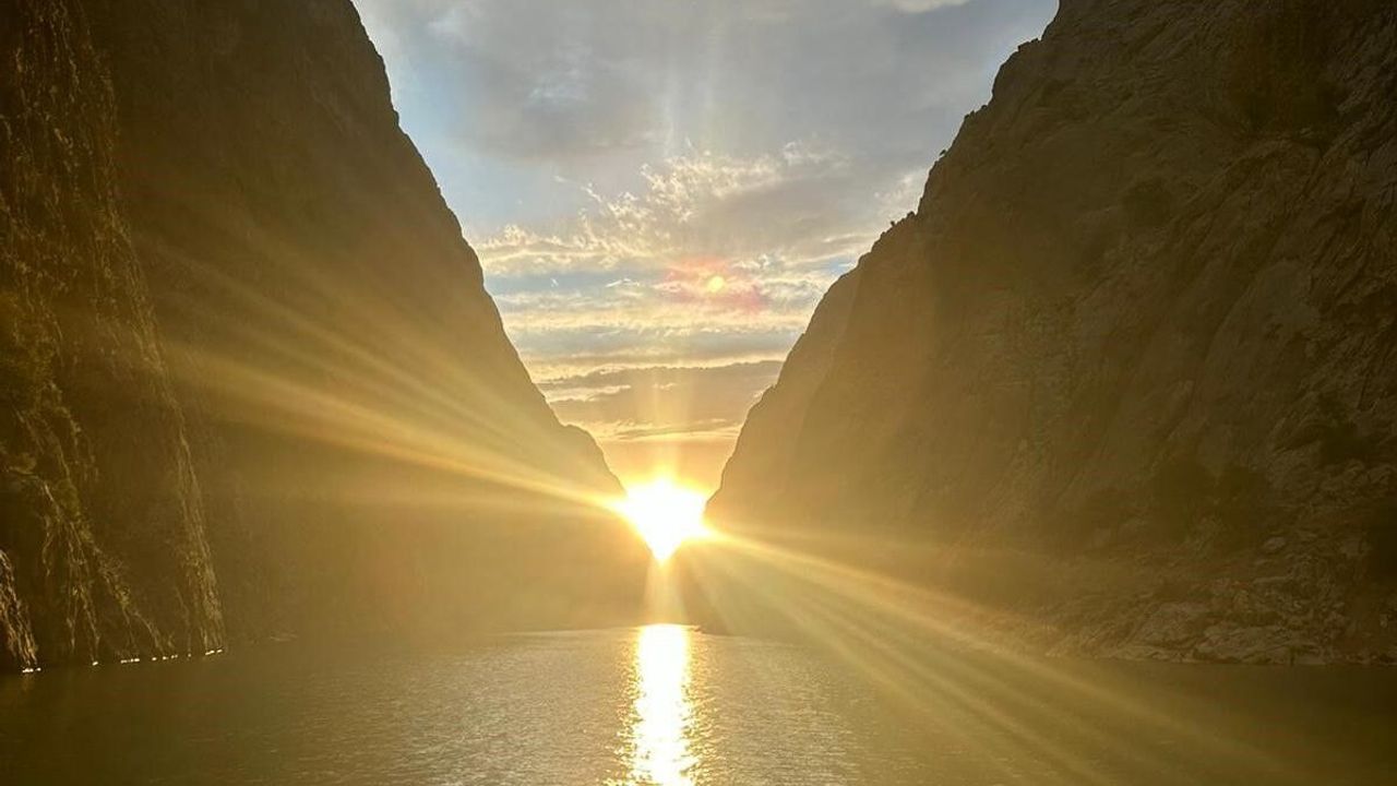 Erzincan’ın Kemaliye ilçesinde bulunan Karanlık Kanyonda bugünlerde kanyonun tam ortasından batan güneş manzarası görenleri hayran bırakıyor. Munzur Dağları üzerinde Karasu Nehri’nin oluşturduğu kanyonda bu manzara sadece 10 gün izleniliyor.