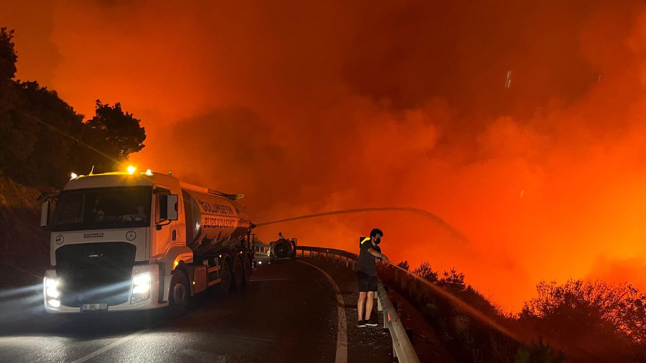 Bursa’nın Kestel ve Gürsu ilçeleri arasındaki ormanlık alanda başlayan yangın etkisini arttırarak devam ediyor. Yangına çok sayıda arazöz, itfaiye aracı ve TOMA karadan müdahale ederken, çok sayıda vatandaş ile personel söndürme çalışmalarına destek veriyor. Ayrıca, karayoluna ulaşan yangın bölgesine araç giriş çıkışı da kapatıldı.