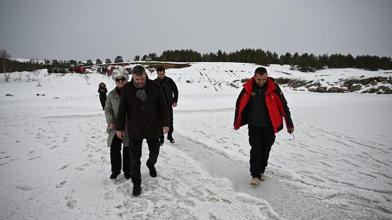 Erzurum Valisi Mustafa Çiftçi, Erzurum Macera Off-Road Doğa Sporları Kulübü üyeleri ile buz tutmuş Köşk Göleti’nde yürüyüş yaptı.