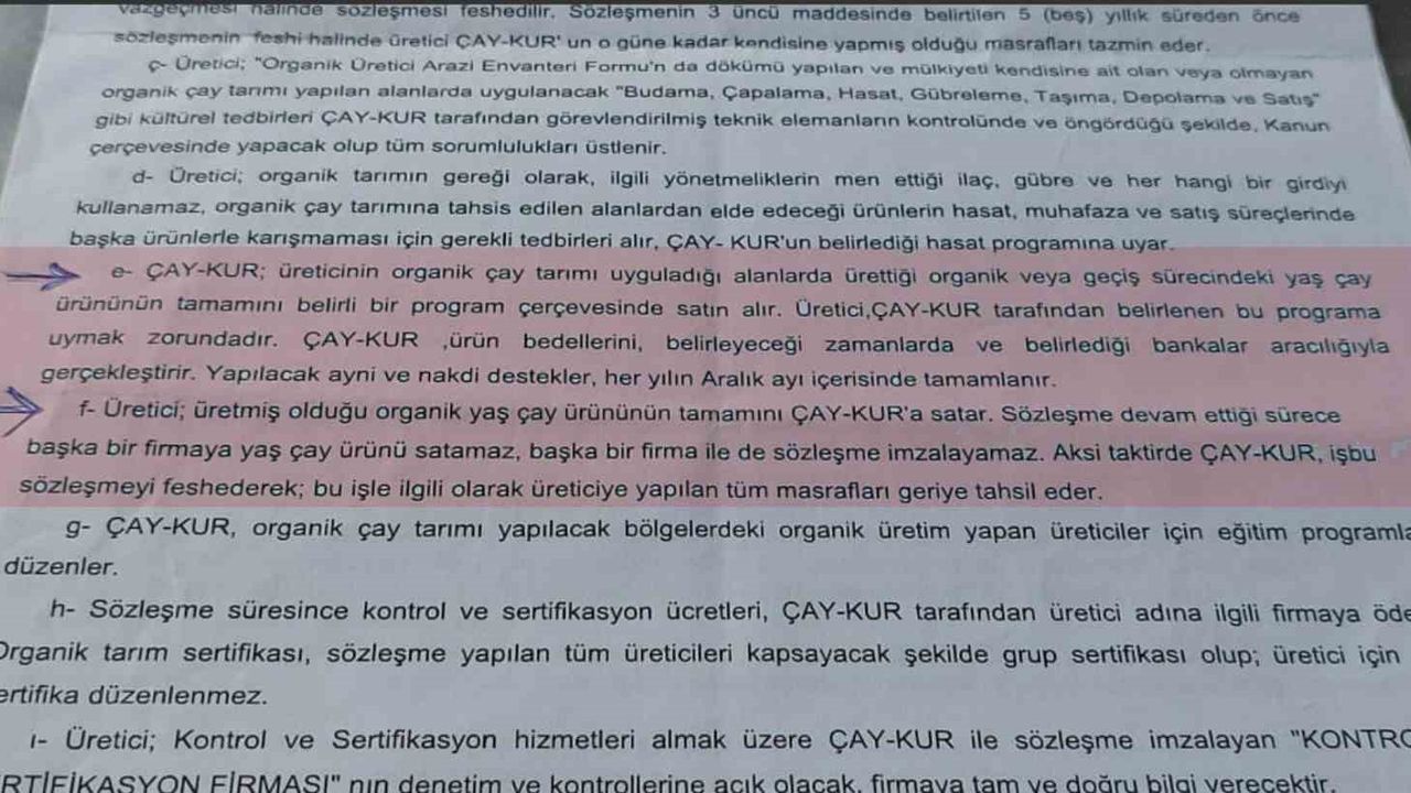 Öte yandan, organik çay üretimine geçiş sürecinde çay üreticileri ile ÇAYKUR arsında bir sözleşme imzalandı. İmzalanan sözleşmede ÇAYKUR’un kota uygulaması koymadan üreticiden bütün çayı alacağı taahhüt edilerek, “Üretici üretmiş olduğu organik yaş çay ürününün tamamını ÇAYKUR’a satar” maddesine yer verilmişti. Maddenin devamında ise üreticinin organik çayı ÇAYKUR’dan başka bir firmaya satması halinde sözleşmenin iptal edilerek kurum tarafından yapılan tüm masrafların üreticiden tahsil edileceği beyan edilerek “Sözleşme devam ettiği sürece başka bir firmaya yaş çay ürünü satamaz, başka bir firma ile de sözleşme imzalayamaz. Aksi taktirde ÇAYKUR iş bu sözleşmeyi feshederek bu işle ilgili olarak üreticiye yapılan tüm masrafları geriye tahsil eder” ifadelerine yer verilmişti.