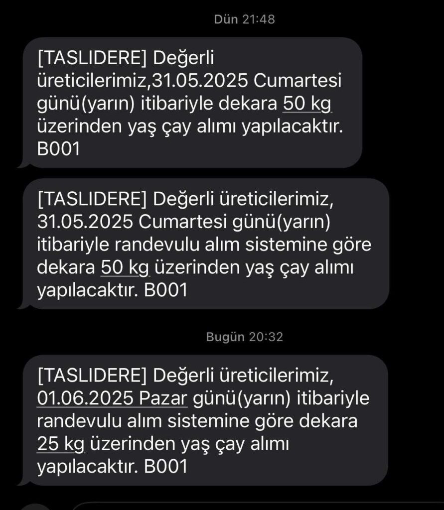 Doğu Karadeniz’in geçim kaynağı olan çay için 16 Mayıs 2025 tarihinde açılan yaş çay hasat sezonu hız kesmeden devam ediyor. Sezonun açılmasıyla hava şartlarının da iyi gitmesini fırsat bilen üreticiler çay bahçelerine girerek çay toplamaya başladı. Çayını erkenden bitirip çay bahçelerinden çıkmak isteyen üreteciler bu nedenle fabrikalarda izdihama yol açtı. Çay makası ile günde 200-250 kilogram çay toplayan bir çay üreticisinin son yıllarda kullanımı artan çay toplama makineleri ile günde 800 kilogramın üzerinde çay toplaması bu izdihamın en büyük etkenlerinden oldu. 15 günde üreticiden 94 bin ton yaş çay alan Çay İşletmeleri Genel Müdürlüğü (ÇAYKUR) tarafından kontenjan uygulamasına geçildi. İlk olarak randevulu sisteme geçiş yaptığını duyuran ÇAYKUR cumartesi günü dekara 50 kilogram olarak açıkladığı kontenjanı pazar günü itibariyle 25 kilograma kadar düştürdü.