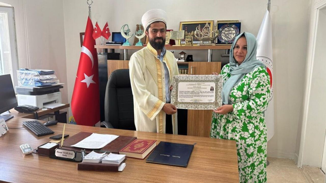 İlçe Müftü Vekili Abdurrahim Yıldırım, müftülükte gerçekleştirilen ihtida töreninde Kur'an-ı Kerim okunduktan sonra Çekya uyruklu Klara Kovarıkova'ya İslam dini hakkında bilgiler verdi. Şahitler huzurunda Kelime-i Şehadet getirerek Müslüman olan ve Esma ismini alan Kovarıkova'ya ihtida belgesi ile birlikte Kur'an-ı Kerim hediye edildi. Daha sonra Müftü Vekili Yıldırım dua okudu.