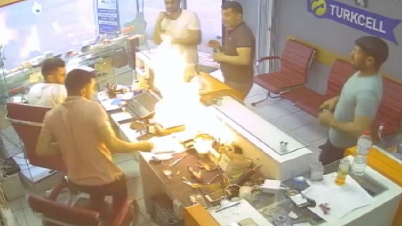 Adana'da cep telefonu teknisyeni olan Halil Bilir'e (29) bataryası şişmiş bir cep telefonu tamir edilmesi için getirildi. Telefonu getiren kişi çıktıktan hemen sonra Bilir müdahale etmeden telefon bir anda bomba gibi patladı. Bu anlar güvenlik kamerasınca kaydedildi.