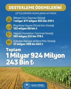 Tarım ve Orman Bakanı İbrahim Yumaklı çiftçileri sevindiren haberi sosyal medya hesaplarından paylaştı. Yumaklı paylaşımında şu ifadeleri kullandı; “1 milyar 924 milyon 243 bin TL tarımsal destekleme ödemesini çiftçilerimizin hesaplarına aktardık. Hayırlı ve bereketli olsun”