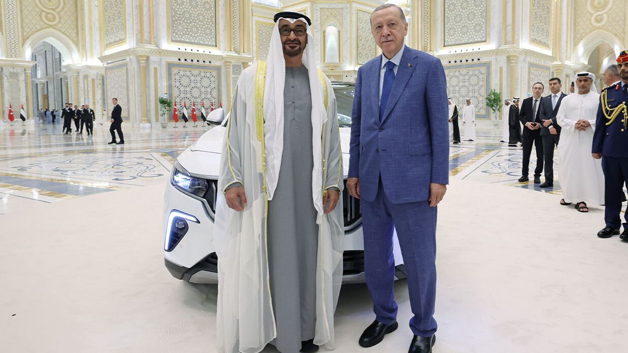 Cumhurbaşkanı Recep Tayyip Erdoğan, Körfez ülkeleri turunun son durağı Birleşik Arap Emirlikleri’nde (BAE) temasları sırasında BAE Devlet Başkanı Şeyh Muhammed Bin Zayed Al Nahyan’a TOGG hediye etti.