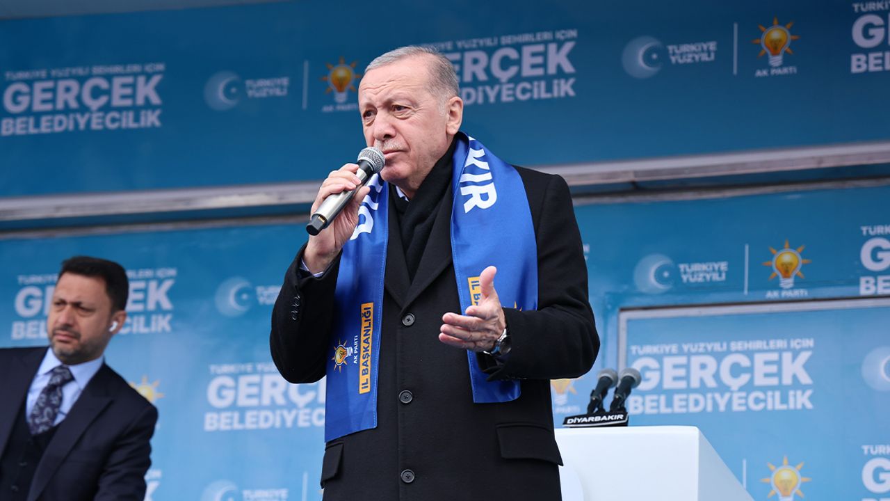 Diyarbakır’dan tüm Kürt seçmenlere seslenen Cumhurbaşkanı Erdoğan, Türkiye Yüzyılı’nı birlikte inşa etme çağrısında bulundu. Erdoğan, "Gelin yeni bir dönemin kapılarını birlikte aralayalım, Türkiye Yüzyılı’nı birlikte inşa edelim. Bugün de Diyarbakır’a 21 yıldır yürüttüğümüz demokrasinin yeni safhasında desteğinizi istemeye geldim. 31 Mart’ta sandıklar değil, eser ve hizmet siyaseti ile istismar ve pazarlık siyaseti yarışıyor. Milli çıkarlarımızı savunurken kimin kuyruğuna bassak hemen soluğu PKK’nın yanında alıyor. DEAŞ denen emperyalist kuklasına göz açtırmıyoruz PKK’yı da sınırlarımız içinde eylem yapamaz hale getirdik, sınırlarımız ötesinde de adım adım güveni oluşturuyoruz. Bu durum karşımızda isteyen herkesin ülkemize karşı kullanabileceği bir maşa olduğunu değiştirmiyor. Çevremizdeki ülkeler kan ve ateş çemberinde kıvranırken bizim huzurumuzu ve güvenimizi bozmaya müsaade etmeyeceğiz" ifadelerini kullandı.