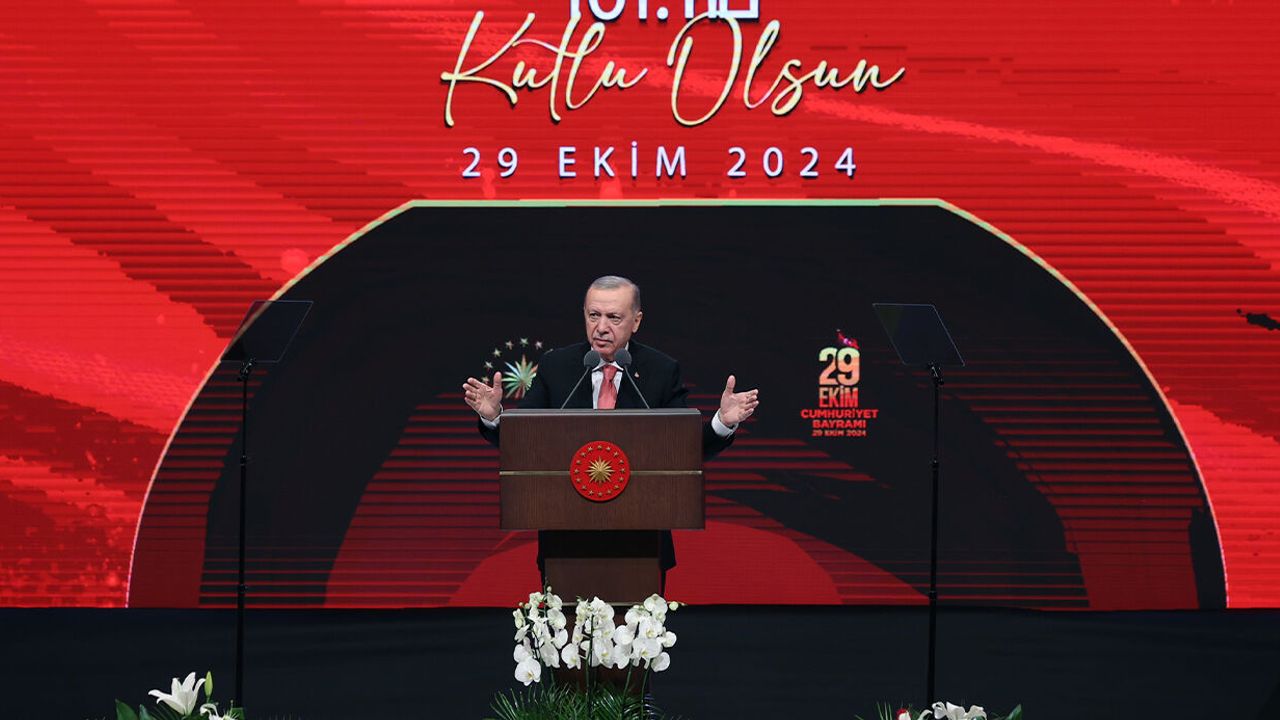 Erdoğan, "Milli Mücadele’nin başkomutanı, Cumhuriyetimizin banisi Gazi Mustafa Kemal Atatürk başta olmak üzere, istiklalimizin ve istikbalimizin inşasında emeği, katkısı olan kahramanlarımızın her birini saygıyla yad ediyorum. Bin yıldır bu toprakları vatanımız olarak tescillemek için canlarını feda etmekten çekinmeyen tüm şehit ve gazilerimizi rahmetle anıyorum. Bugün de, ister üniformalı, ister TUSAŞ’ta olduğu gibi üniformasız olsun, milletimizin huzuru ve devletimizin bekası uğrunda hayatları pahasına mücadele eden kahramanlarımıza şükranlarımı sunuyorum. Biz milletçe birliğimize ve beraberliğimize sahip çıkarak iç cepheyi sağlam tuttukça, ne terör örgütleri, ne de onları besleyip semirterek üzerimize salan şer güçleri emellerine ulaşamayacaktır. Nevzuhur devletlerin, köksüz toplumların, kendi çıkarları dışında hiçbir insani değeri önemsemeyen “küresel tröstlerin” anlamadıkları bir hakikat var: Bu hakikat, Türkiye Cumhuriyetinin, bizim binlerce yıllık devletler silsilemizin son temsilcisi olduğudur. Onlar sanıyorlar ki, bu milletin devleti sadece 101 yıllık geçmişe sahiptir” dedi.