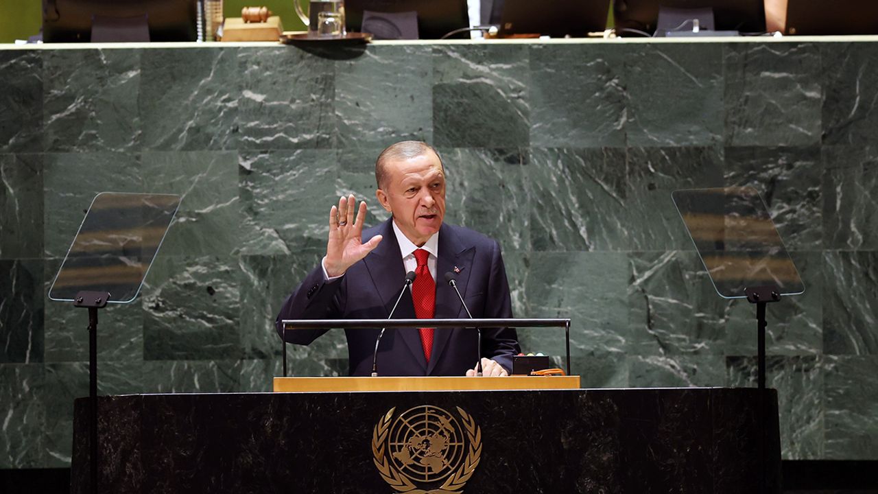 Cumhurbaşkanı Recep Tayyip Erdoğan, Birleşmiş Milletler 78. Genel Kurulunda konuştu. Güven ve dayanışma içerikli bir temayla toplanan 78’inci Genel Kurul’un tüm insanlık için hayırlara vesile olmasını temenni eden Cumhurbaşkanı Erdoğan, “Dünyamızın geleceği konusunda, geçtiğimiz yıl burada yaptığımız değerlendirmelere kıyasla daha iyimser bir tablo çizmek maalesef mümkün değildir. Karşımızdaki fotoğraf; küresel ölçekte, giderek daha fazla, daha karmaşık, daha tehlikeli sınamalarla karşı karşıya olduğumuzu gösteriyor” dedi.