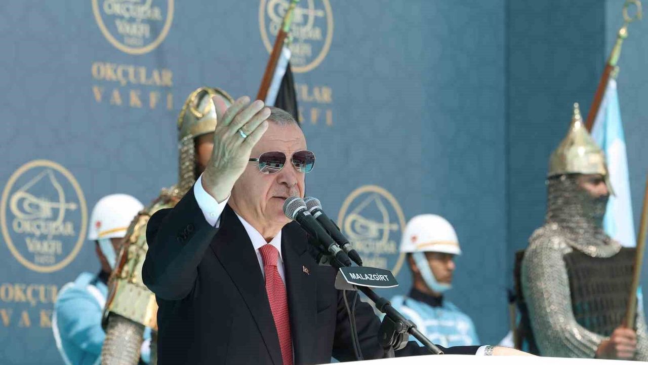 Malazgirt, bir zaferden öte yurt doğuran, medeniyet doğuran, bir inşa ve ihya hareketinin de başlangıcı olduğunu belirten Erdoğan, “Çünkü bu toprağı, taşı coğrafyayı vatan yapmak için ruh gerekir, kültür gerekir, bilinç gerekir, inanç gerekir. Tüm bunlarla birlikte o toprakların hamurunu kanla karmak, imanla yoğurmak, terle sulamak gerekir. Millet olarak Malazgirt sonrasında Anadolu’yu işte böyle vatan yaptık. Bu toprakları aşkla, sevgiyle, ilim ve hikmetle ilmek ilmek dokuduk. Fethettiğimiz her yeri camilerle, kütüphanelerle medreselerle doldurduk. Anadolu’nun ezeli ve ebedi Türk yurdu olduğunu tüm cihana ilan ettik. İstanbul’un fethine giden sürecin en kritik adımını Malazgirt’te atılmıştır. Malazgirt Zaferi ayrıca Kudüs’ün fethinin önünü açan stratejik bir dönüm noktası olmuştur” ifadelerini kullandı.
