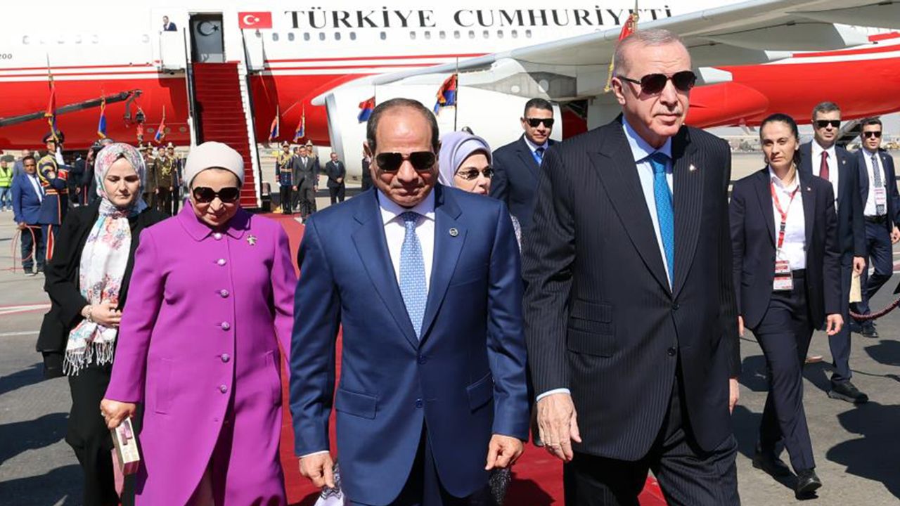 Riyad Kral Halid Uluslararası Havalimanı'ndan "TUR" uçağıyla Mısır’ın başkenti Kahire’ye gelen Cumhurbaşkanı Erdoğan, Kahire Uluslararası Havalimanı’nda Mısır Cumhurbaşkanı Abdulfettah es-Sisi ve eşi Entissar Amer ile Türkiye'nin Kahire Büyükelçisi Salih Mutlu Şen tarafından karşılandı.
