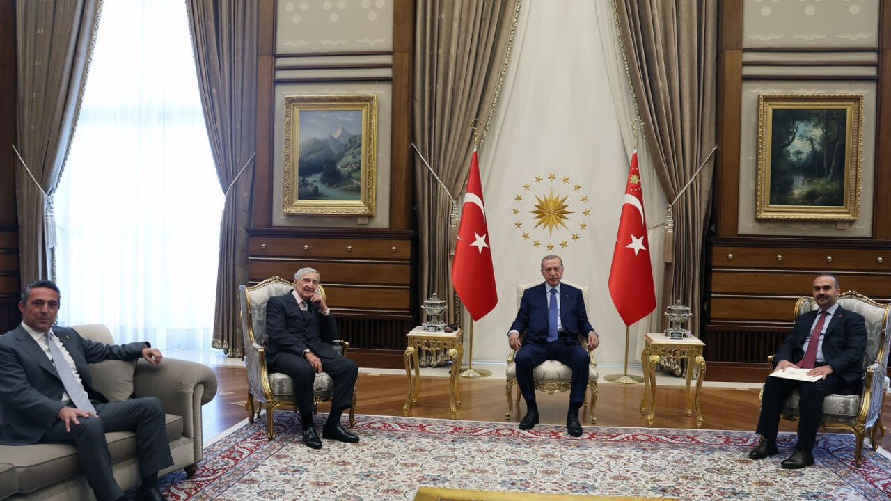 Cumhurbaşkanı Recep Tayyip Erdoğan, Sanayi ve Teknoloji Bakanı Mehmet Fatih Kacır ile iş insanları Rahmi Koç ve Ali Koç'u Cumhurbaşkanlığı Külliyesi'nde kabul etti.