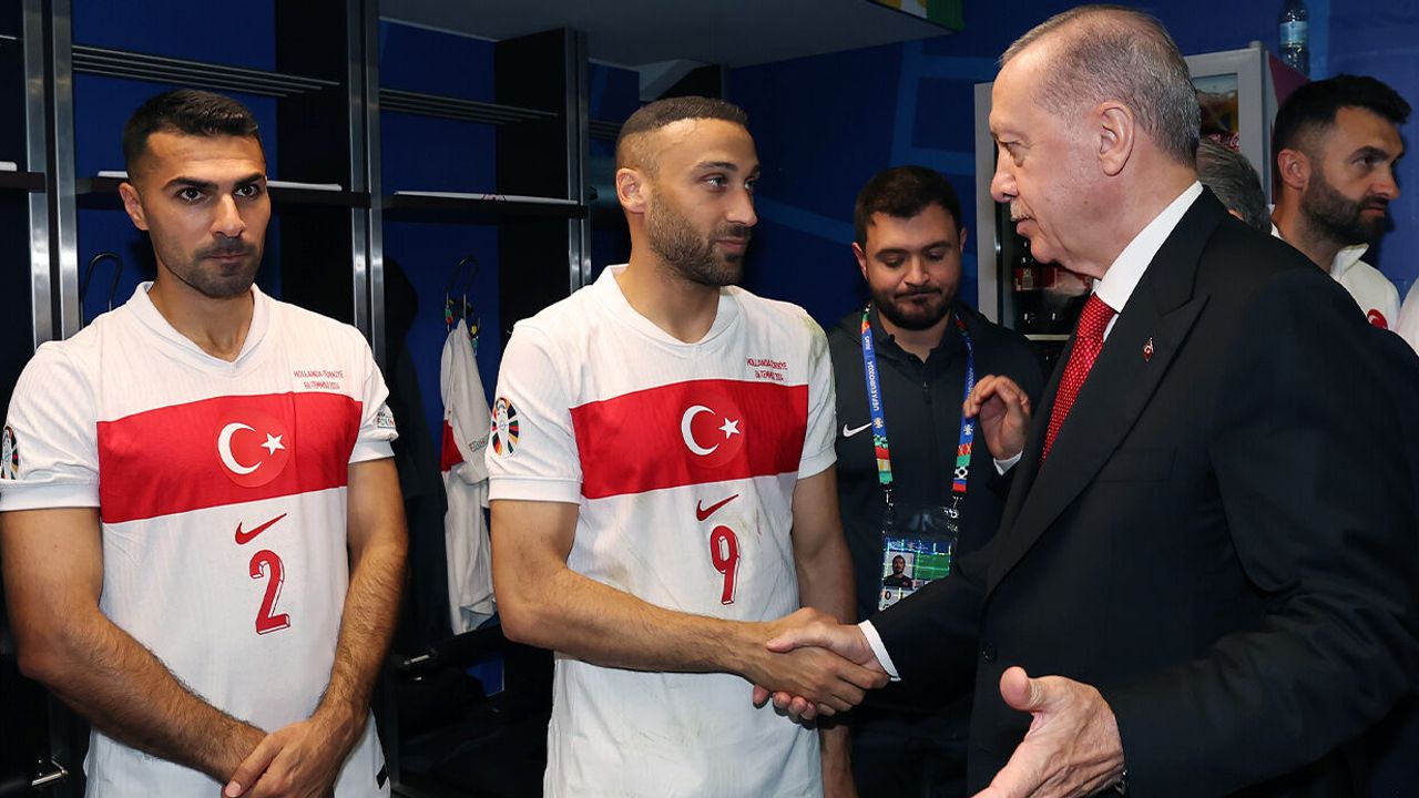 2024 Avrupa Futbol Şampiyonası (EURO 2024) çeyrek final maçında A Milli Futbol Takımı, Hollanda'ya 2-1 yenilerek turnuvaya veda etti. Karşılaşma için Almanya'ya giden Cumhurbaşkanı Recep Tayyip Erdoğan, müsabakayı Berlin Olimpiyat Stadyumu'nda protokol tribünden takip etti. Cumhurbaşkanı Erdoğan, müsabaka sonrası Türk Milli Takımı soyunma odasına inerek, tek tek futbolcuları tebrik etti. İyi mücadele ettiklerine vurgu yapan Erdoğan, "Hepinizi tebrik ediyorum. Her ne kadar bugün burada bu neticeyi aldıysak da siz bizim şampiyonumuzsunuz. Biz sizden memnunuz. Bunun geleceği de var, gelecekte de biz bu işi götüreceğiz. Ben buna inanıyorum. Buraya kadar bu işi çok başarılı getirdiniz" ifadelerini kullandı.