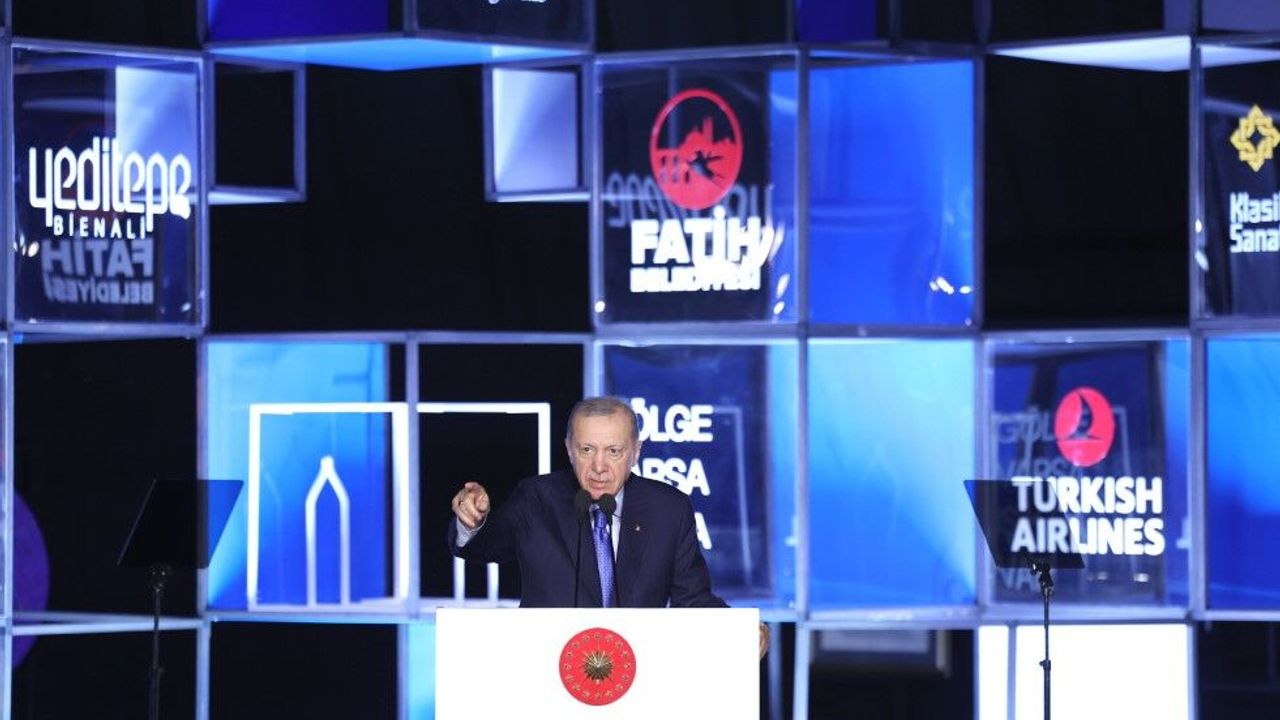 Türkiye denince zihinlerde sadece siyasi sınırların canlanmadığını, bunun ötesinde geniş bir gönül ve kültür coğrafyası akıllara geldiğini ifade eden Cumhurbaşkanı Erdoğan, "Üstat Necip Fazıl’ın ’Anladım işi, sanat Allah’ı aramakmış. Marifet bu, gerisi yalnız çelik çomakmış’ mısralarında ifade ettiği maveranın, ötelerin marifet ve hakikatin peşinden işte bu imanla koşarız. Bu bakımdan ’Gölge varsa ışık da vardır’ sözü, umudu müjdeliyor, mücadeleyi salık veriyor, inanç ve gayreti telkin ediyor. Her gecenin bir sabahı olduğunu, aydınlığın ve inancın küfre mutlaka galip geleceğini işaret ediyor. Merhum Sezai Karakoç’un ’Geceyi onaran bir mimar vardır’ dediği o mimarın hikmetine vasıl olmayı Rabbim hepinize, hepimize nasip eylesin diyorum. Yeditepe Bienali’ni Türkiye’nin kültürel birikimini evrensel bir sahneye taşıyan kıymetli bir platform olarak görüyoruz. Buradaki eserlerin hal dili, dünyaya ’Bizim de söyleyecek sözlerimiz var’, ’Yüksek bir estetik anlayışımız’, ’İnsanlığın hazinesine katacak eşsiz mücevherlerimiz var’ diyor. Hat, tezhip, ebru, minyatür gibi kadim sanatlarımız bu bienal vesilesiyle ülkemizin marka değerine küresel çapta önemli bir katkı sağlıyor. Kültürel diplomasimize dinamizm kazandırıyor. Bugün Türkiye denince zihinlerde sadece siyasi sınırlarımız canlanmıyor. Bunun da ötesinde geniş bir gönül ve kültür coğrafyası akıllara geliyor. Resmi kurumlarımız, vakıflarımız, derneklerimiz ve daha niceleri gönül coğrafyamızdaki dost ve kardeşlerimizle olan muhabbetimizi günden güne pekiştiriyor. Yeditepe Bienali’ni Türkiye’nin kültürel birikimini evrensel bir sahneye taşıyan kıymetli bir platform olarak görüyoruz. Buradaki eserlerin hal dili, dünyaya ’Bizim de söyleyecek sözlerimiz var’, ’Yüksek bir estetik anlayışımız’, ’İnsanlığın hazinesine katacak eşsiz mücevherlerimiz var’ diyor. Hat, tezhip, ebru, minyatür gibi kadim sanatlarımız bu bienal vesilesiyle ülkemizin marka değerine küresel çapta önemli bir katkı sağlıyor. Kültürel diplomasimize dinamizm kazandırıyor. Bugün Türkiye denince zihinlerde sadece siyasi sınırlarımız canlanmıyor. Bunun da ötesinde geniş bir gönül ve kültür coğrafyası akıllara geliyor. Resmi kurumlarımız, vakıflarımız, derneklerimiz ve daha niceleri gönül coğrafyamızdaki dost ve kardeşlerimizle olan muhabbetimizi günden güne pekiştiriyor" dedi.