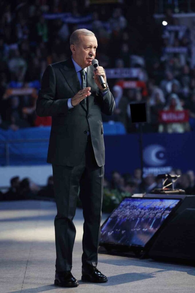 AK Parti’nin üye sayısıyla dünyanın en büyük partileri sıralamasında ilk 5’te yer alan bir siyasi kuruluş olduğunu söyleyen Erdoğan, "Bundan 4 ay önce, iktidardaki 22 yılımızı şanla, şerefle dünya siyaset literatürüne geçen muazzam bir başarıyla imzayı attık. Bu eşsiz başarıya, öyle çilingir sofralarında kadeh tokuşturarak, kaynağı belirsiz balya balya paralardan kuleler yaparak ulaşmadık. Bu tarihi başarıyı, aziz milletimizin umutlarını, beklentilerini ve hayallerini siyasete taşıyarak yakaladık. Millete hizmet yolculuğuna başlarken ‘artık Türkiye’de hiçbir şey eskisi gibi olmayacak’ dedik ve bunda da muvaffak olduk. Önce davamızın gücünü ülkemizin gücü haline getirdik, sonra ülkemizin gücüyle bölgesinde ve dünyada lider bir Türkiye inşa ettik. Yola çıkarken kimse bize gül bahçesi vaat etmemişti; biz o gül bahçesini kendi ellerimizle adım adım kendimiz kurduk. Kapı kapı dolaşarak, köy köy gezerek, gecemizi gündüzümüze katarak, nice tuzağı bozarak, nice engeli, nice bariyeri asarak, gönül bahçelerine diktiğimiz gülleri tek tek suladık, besledik ve büyüttük. Gençlerimizin özellikle şuraya dikkat etmesini istiyorum. Gençler, bakın, biz sadece seçimleri kazanarak değil, asıl gönülleri kazanarak 22 yıldır iktidardayız" şeklinde konuştu.