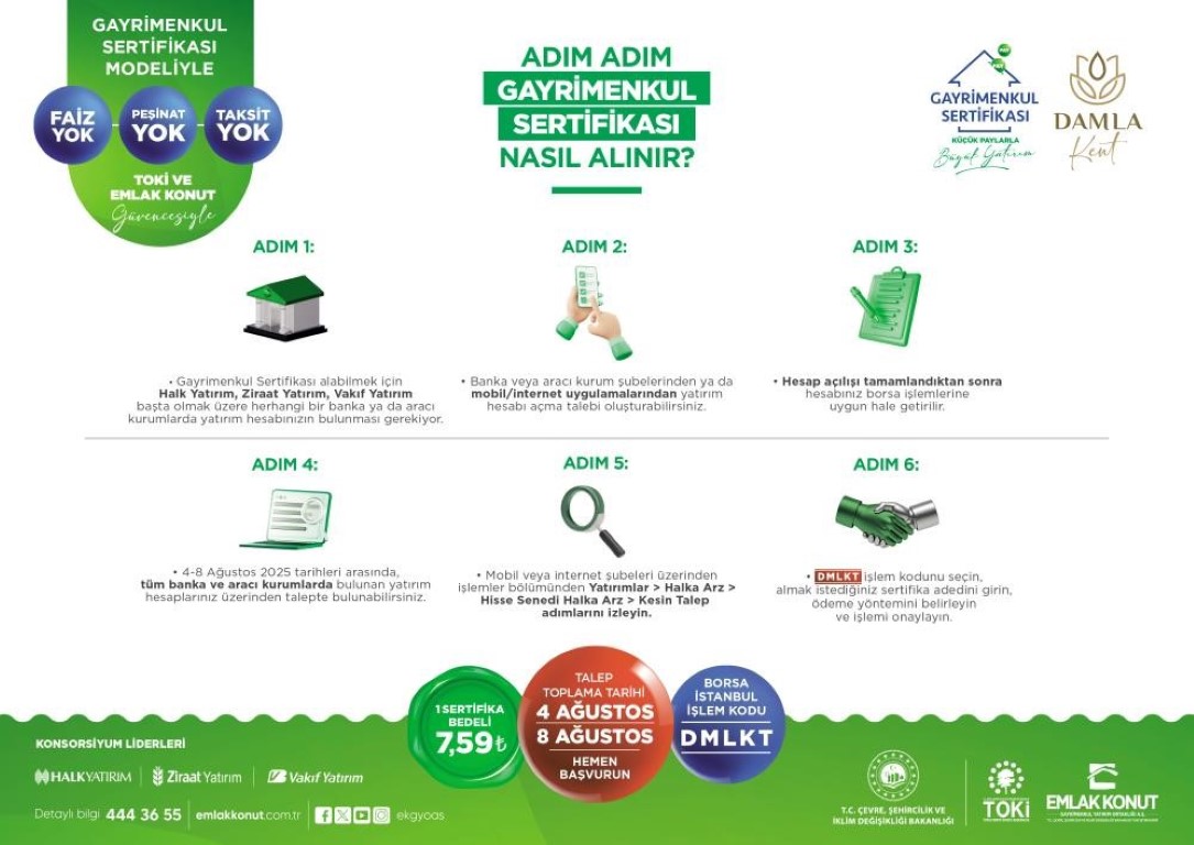 İstanbul Başakşehir’de hayata geçirilecek Damla Kent projesine ait Gayrimenkul Sertifikası’nda talep toplama süreci bugün başladı. Çevre, Şehircilik ve İklim Değişikliği Bakanlığı koordinasyonunda TOKİ ve Emlak Konut GYO tarafından hayata geçirilen Gayrimenkul Sertifikası modeliyle, küçük paylarla büyük yatırım imkânı sunuluyor. Farklı gelir gruplarının konut sahibi olabilmesini hedefleyen bu yeni yatırım aracı, yatırımcılara hem konut edinme hem de alım-satım yoluyla birikimlerini değerlendirme fırsatı tanıyor. 7,59 TL fiyatla Borsa İstanbul’da "DMLKT" koduyla işlem gören sertifikalar için talepler 8 Ağustos’a kadar oluşturulabilecek.