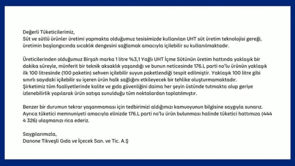 "Süt ve sütlü ürünler üretimi yapmakta olduğumuz tesisimizde kullanılan UT süt üretim teknolojisi gereği, üretimin başlangıcında sıcaklık dengesini ağlamak amacıyla içilebilir su kullanılmaktadır. Üreticilerinden olduğumuz Birşah marka 1 litre yüzde 3,1 Yağı UHT İçme Sütünün üretim hattında yaklaşık bir dakika süreyle, münferit bir teknik aksaklık yaşandığı ve bunun neticesinde 176.L parti no’lu ürünün yaklaşık ilk 100 litresinde (100 paketin) sehven içilebilir suyun paketlendiği tespit edilmiştir. Yaklaşık 100 litre gibi sınırlı sayıdaki içilebilir su içeren ürün halk sağlığını etkileyecek bir tehlike oluşturmamaktadır. Şirketimiz tüm faaliyetlerinde kalite ve gıda güvenliğini daima her şeyin üstünde tutmakta olup geriye izlenebilirlik yapılarak ürün satışa sunulduğu tüm noktalarda toplatılmıştır."