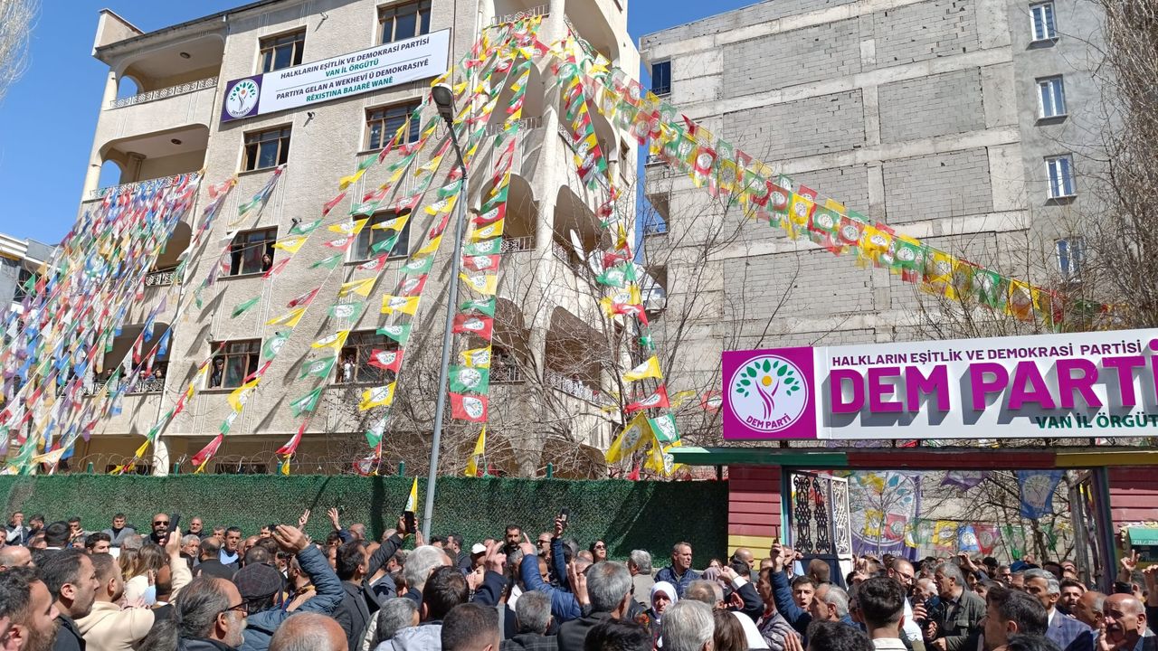 Van Büyükşehir Belediyesi Başkanı seçilen Abdullah Zeydan’ın memnu haklarının geri alınmasına DEM Partililer tepki gösterdi. Karara itiraz eden partililer Van DEM Parti binası önüne gelerek Zeydan’a destek oldu.